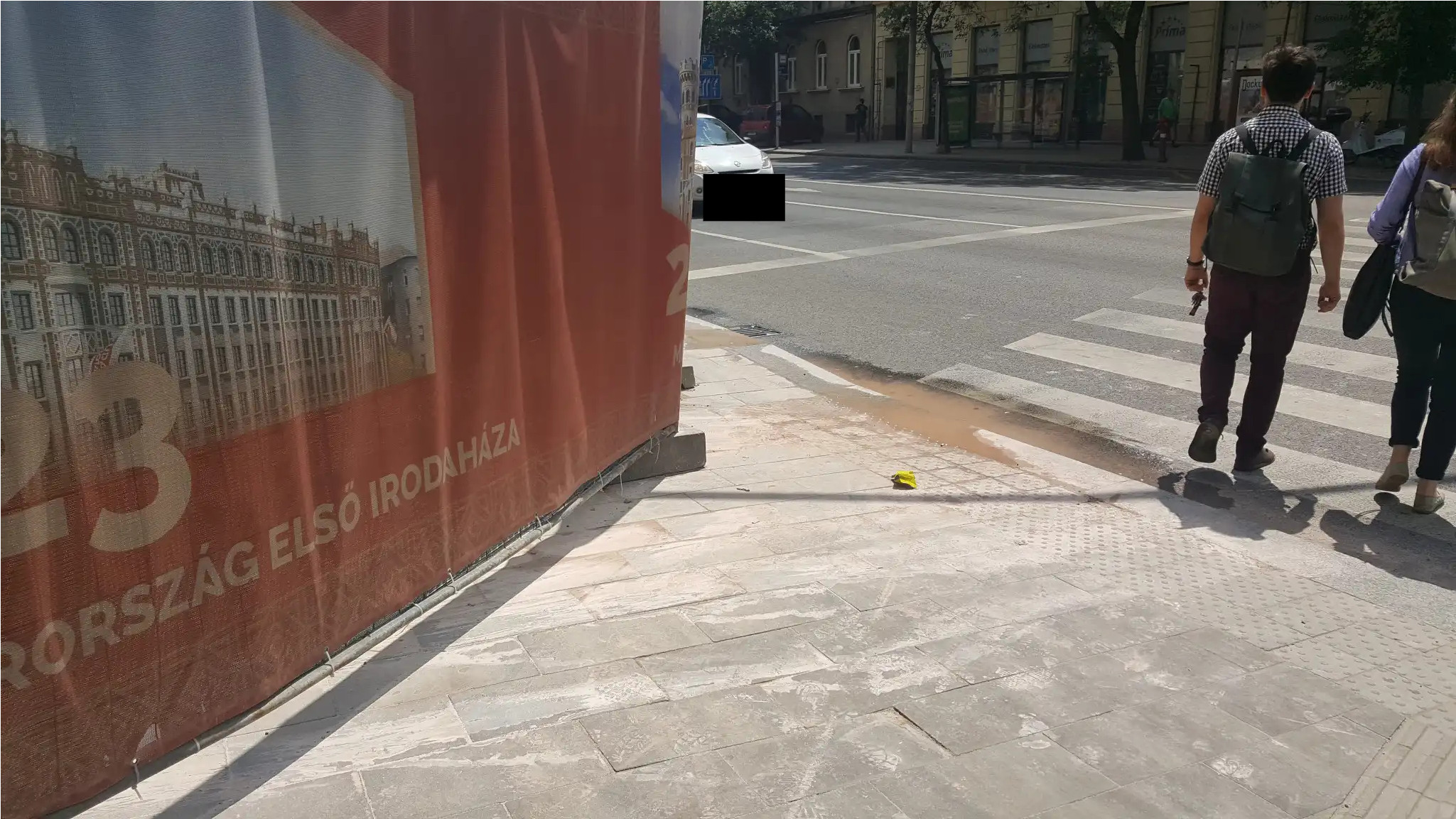 A Postapalota felújítása során a kivitelező nem gondoskodott a tisztításra szolgáló víz elvezetéséről, ami így a járdára és az úttestre folyik.