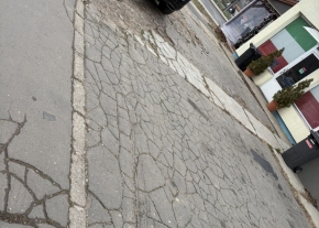 A Vasarcsarnok oldalában egy gyalogátkelővel szemben néhány oszlop erősen megdőlt, akadályozva az átkelő kényelmes használatát.