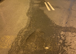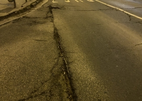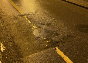 Van egy hatalmas és mély lyuk a buszmegállóban. Konkrétan a busz egész kereke belefér.