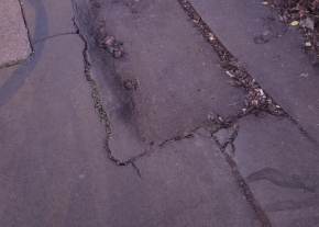 Az esőzések alámosták a járdát. Vele egyvonalban az úttest felé is van egy lyuk.
