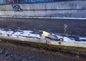A Lázár és Nagysándor József utca sarkán lévő járdaszigeten össze van matricázva a kikerülési irányt mutató tábla.