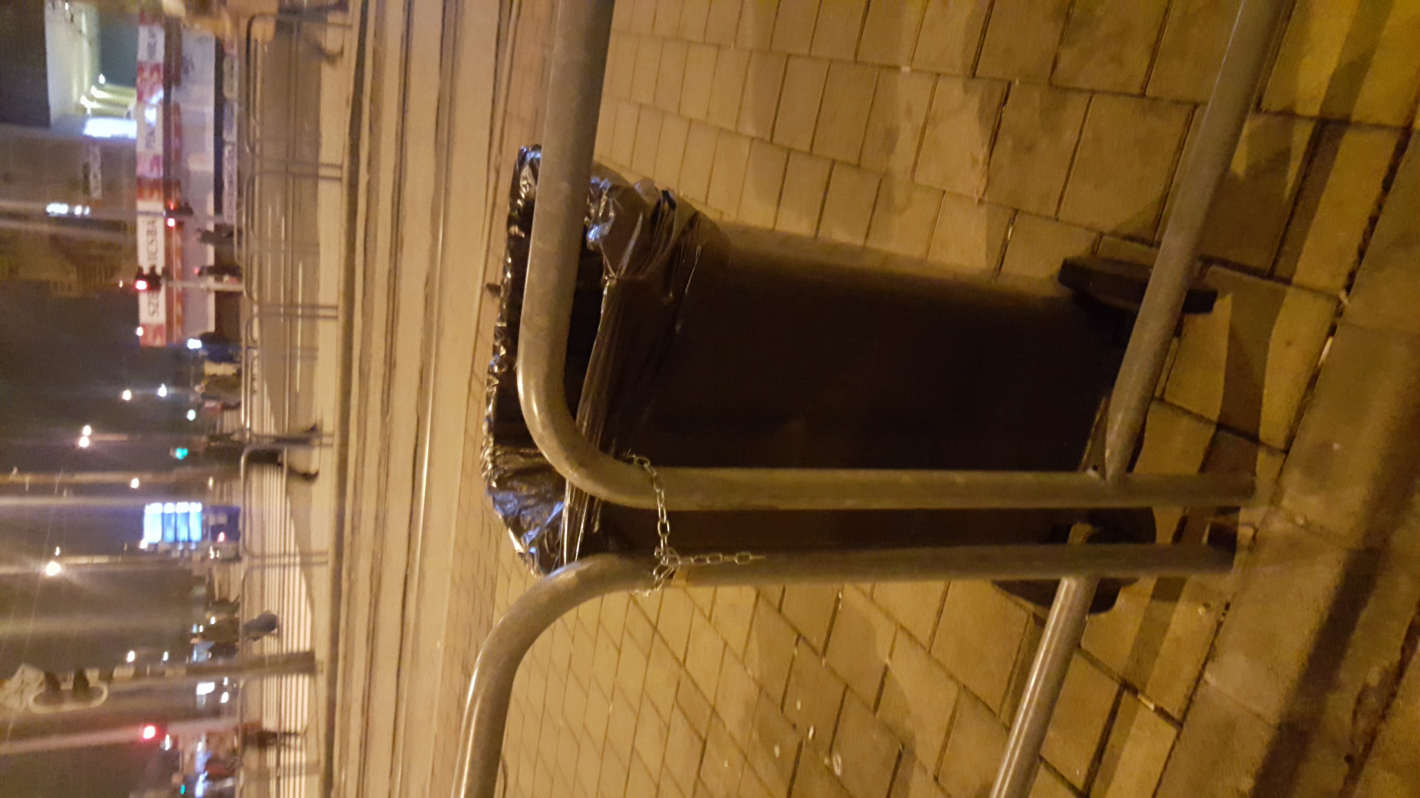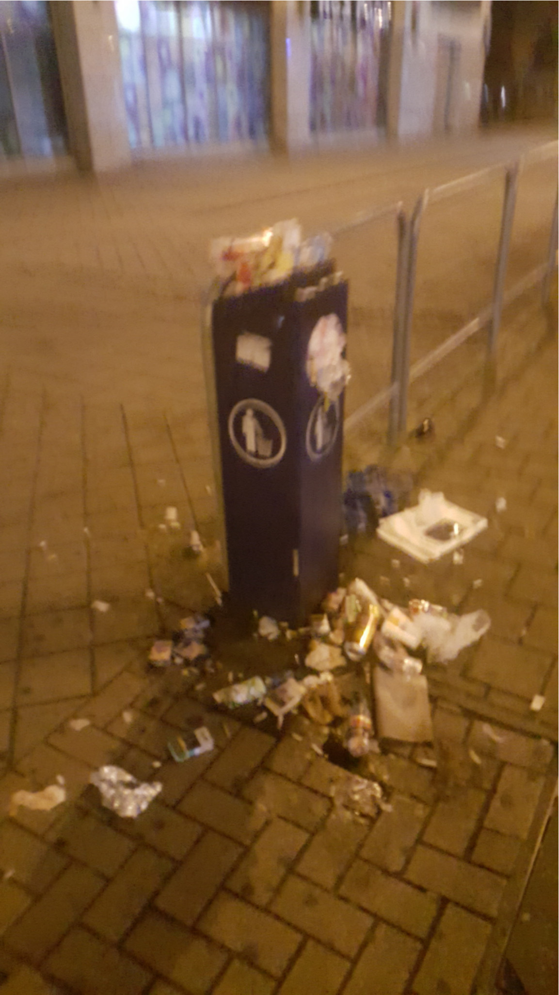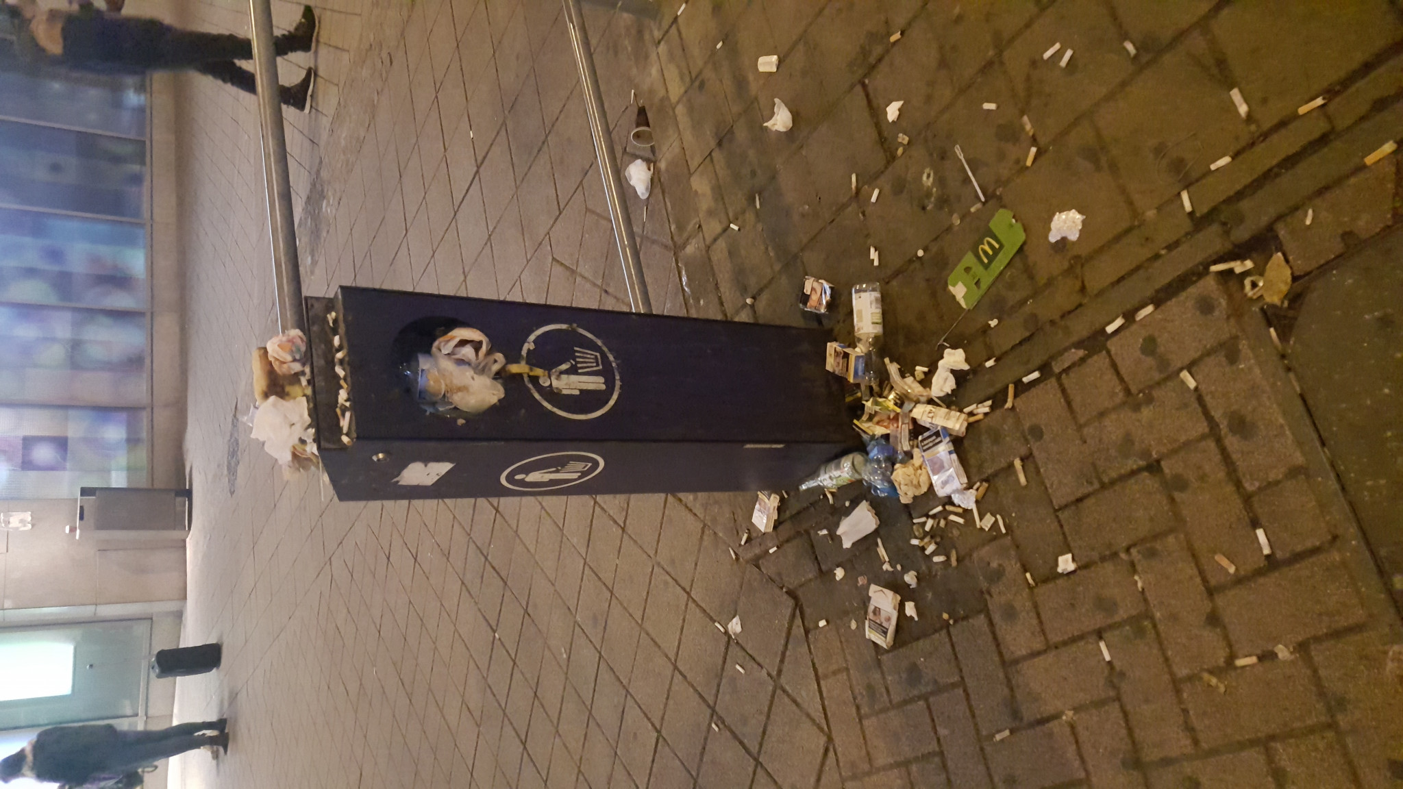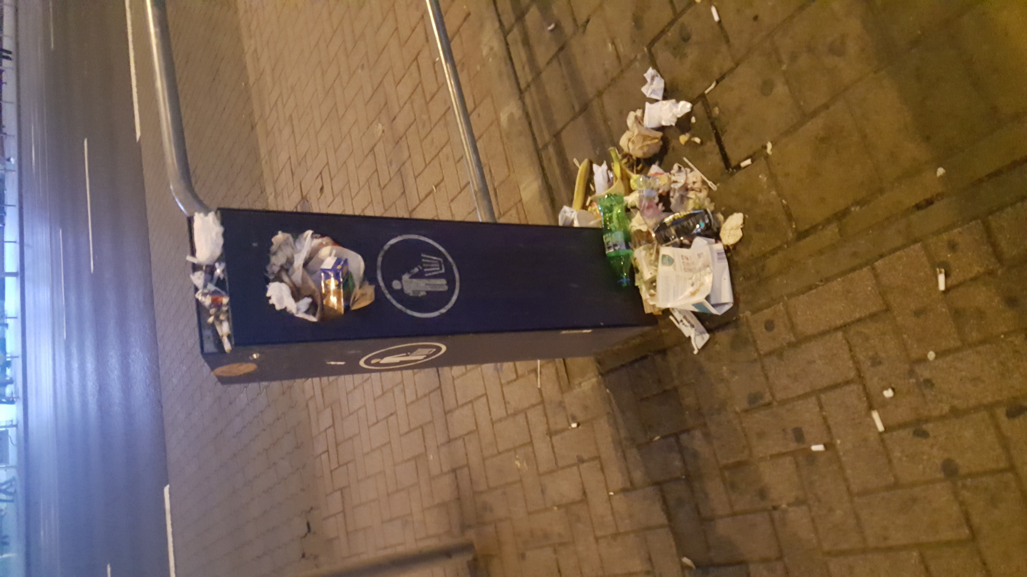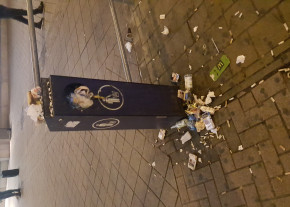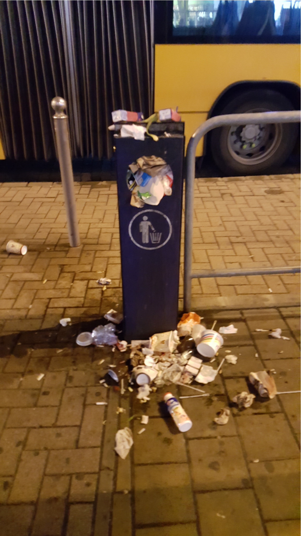 Az Örs vezér terén a villamosmegálló szemetesei este 23.30 körül pontosan ugyanolyan undorító állapotban voltak, mint 5 órával előtte 18.30-kor.