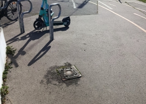 A Fő téren a buszmegállóból elvezető járda elején van ez az Ausztria alakú kátyú. Rendkívül balesetveszélyes.