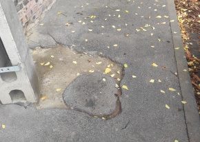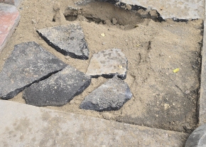 A Gutenberg tér Bródy Sándor utca sarkon "áll" egy telefonfülke kissé ferdén mert a díszburkolatot kispórolták alóla.