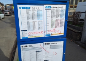 Az 51-es, 52-es villamos Kossuth Lajos utca megállójában össze van firkálva a menetrendet tartó tábla hátulja.