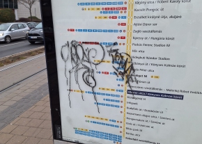 Kérem, hogy a Nánási út nevű buszmegálló táblájáról mossák le a firkát!