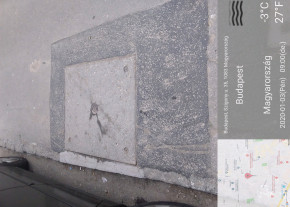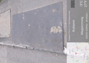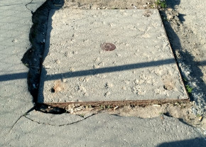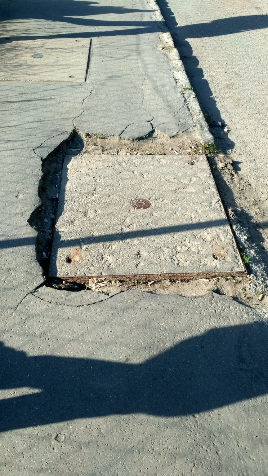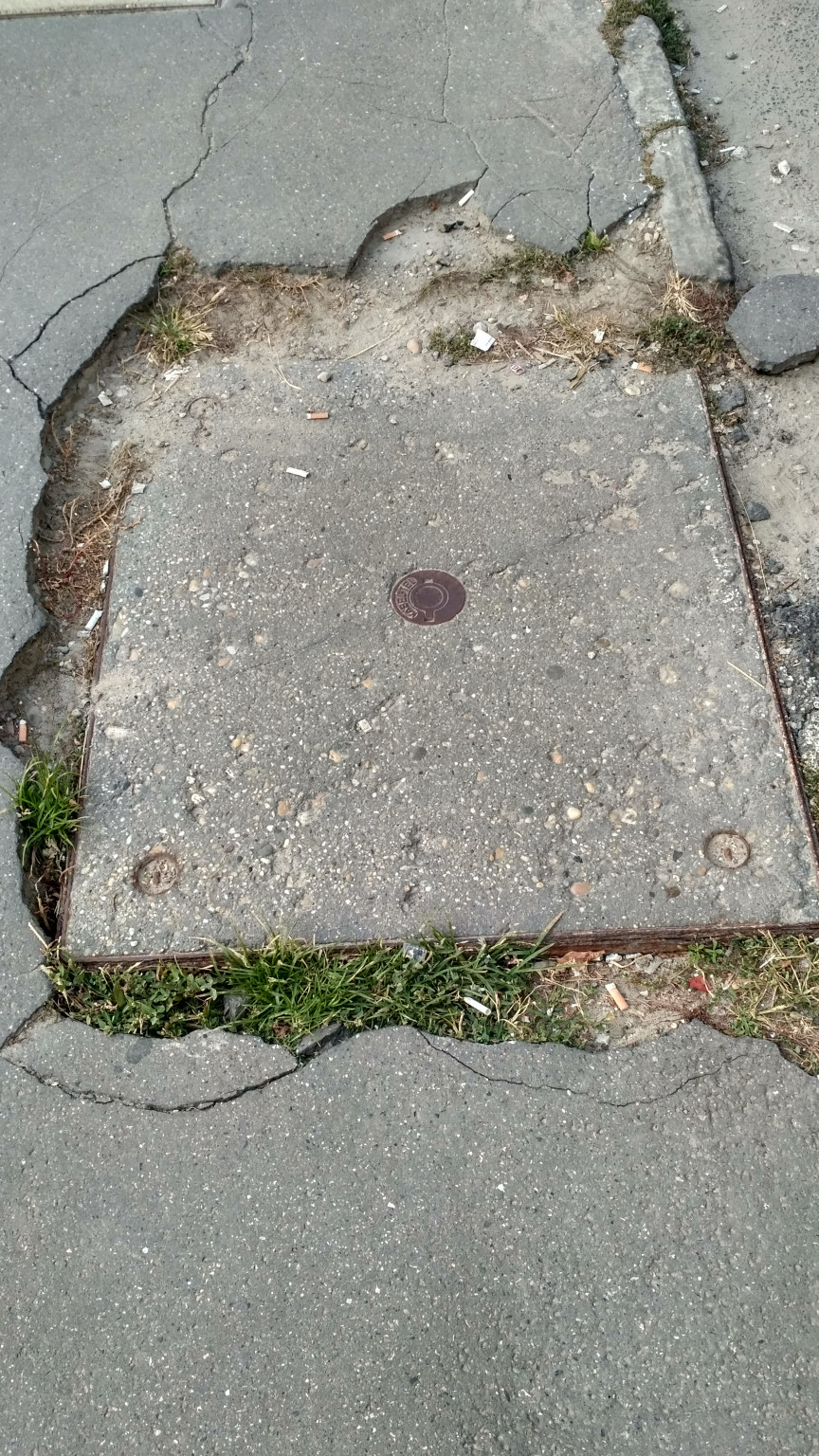 Beomlott a járda a fedlap körül. A fedél pedig megsüllyedt és billeg. Balesetveszélyes.