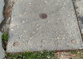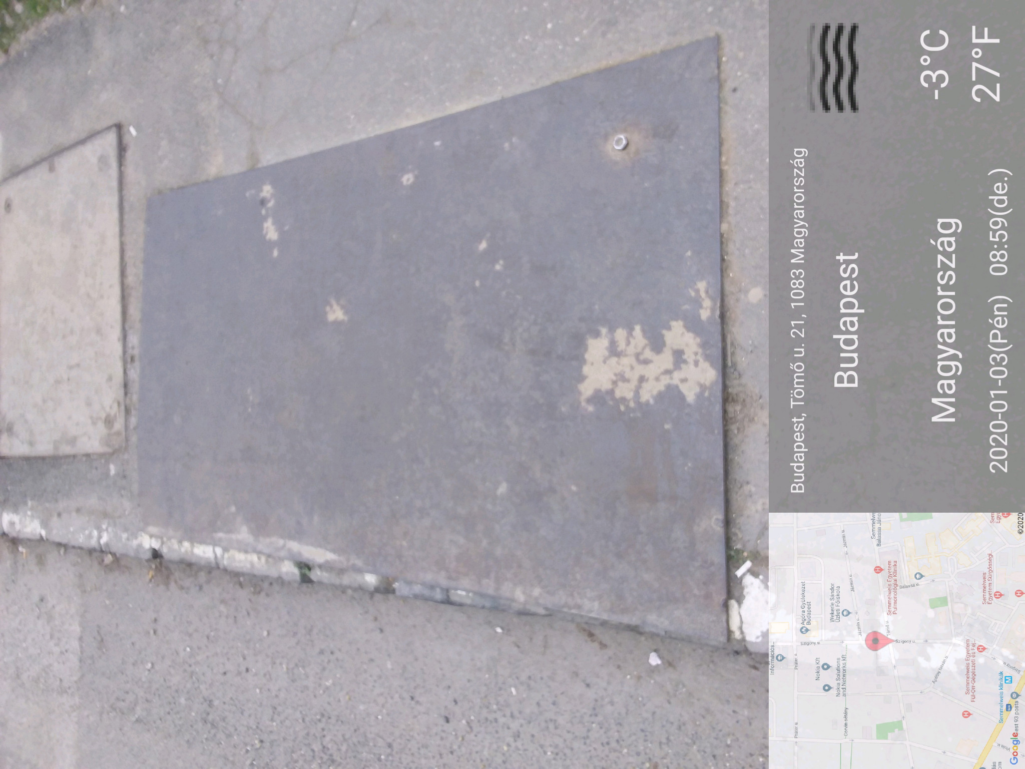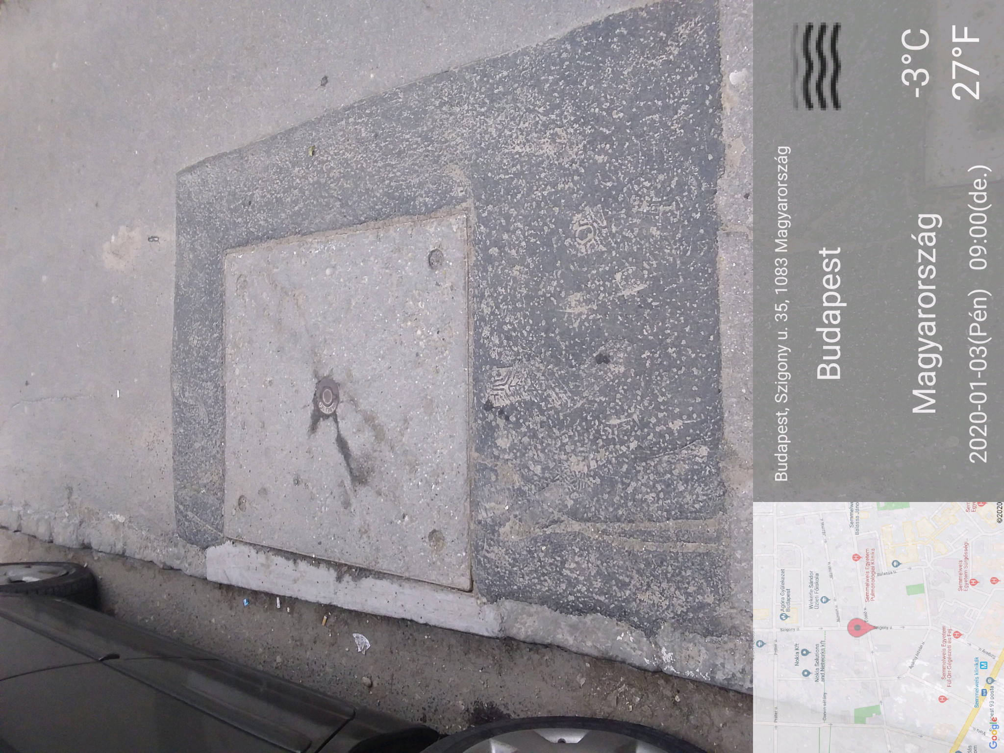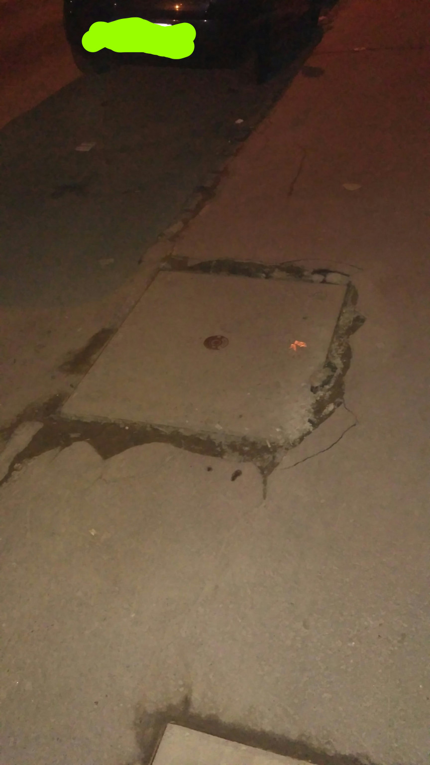 Beomlott a járda a fedlap körül. A fedél pedig megsüllyedt és billeg. Balesetveszélyes.