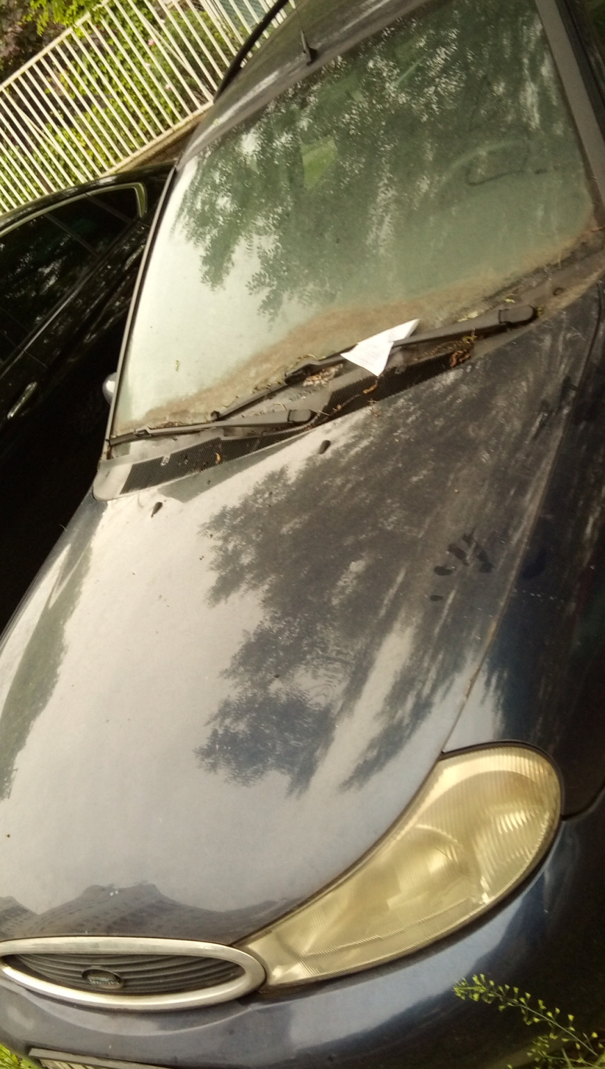 Ahogy a képen látható, ez a Ford már elég régóta áll az Etele út 30-32. mögötti parkolóban: körbenőtte a gaz, a szélvédőn többhetes szórólapmaradványok, az ablakok olyan koszosak, hogy be se látni rajta.