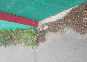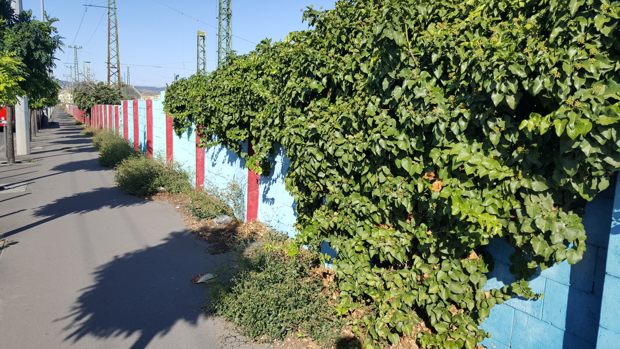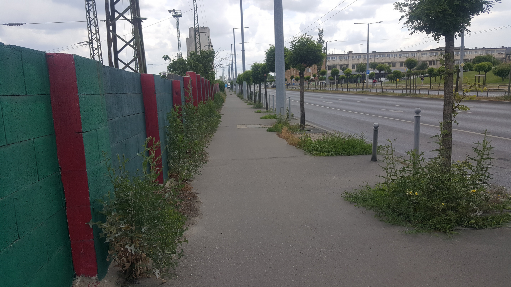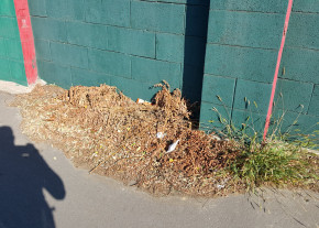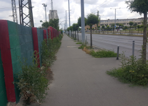 Egyre nagyobb a mocsok, a gaz és a szemét. A járda és a kerítés illesztéséből kinövő növények pedig jelentős területet foglalnak el a járdából.