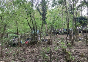 Egy kupac szemét az út mentén. Nem mostanában lett lerakva. A pontos helyszín a Budatétényről a 6-os útra bekötő felüljáró déli oldalában. Autóval csak a Háros utca 7 irányából megközelíthető.
