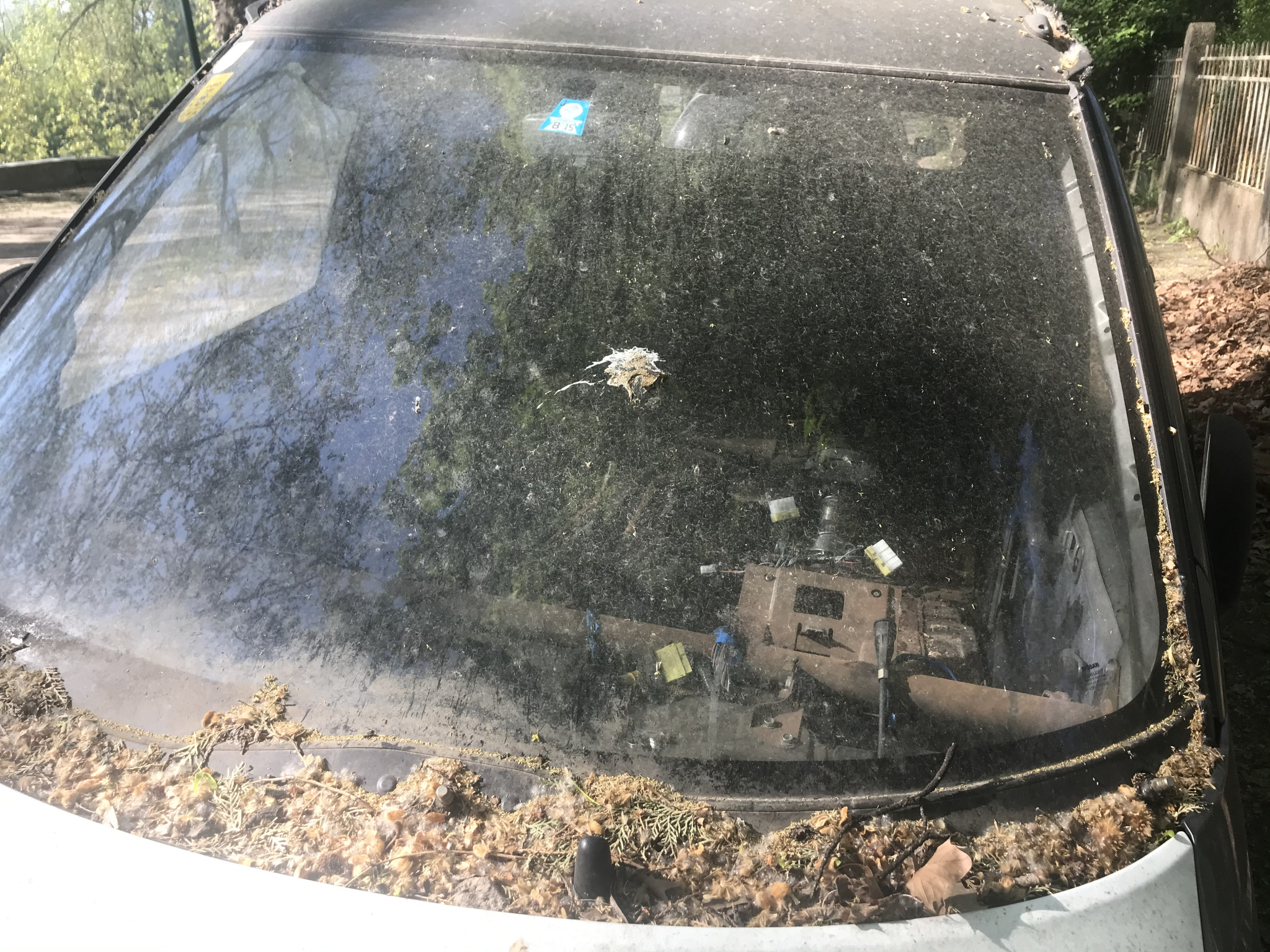 Rendszám nélküli kisbusz, törötten és kibelezve.