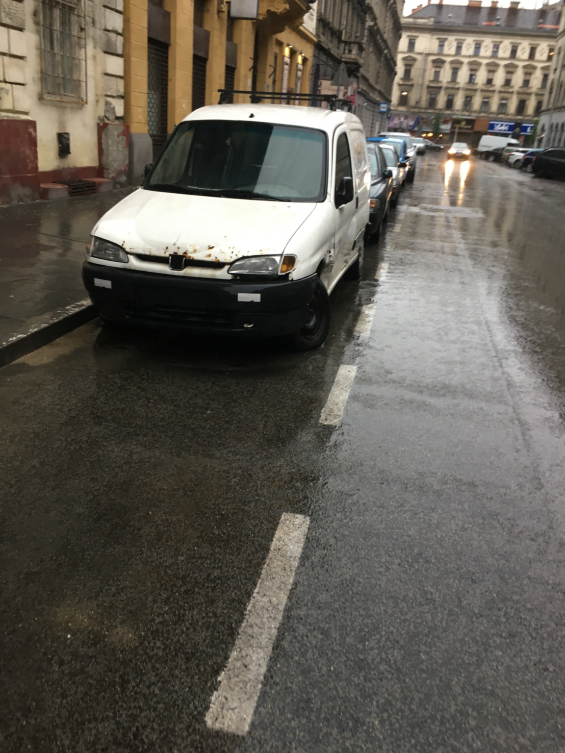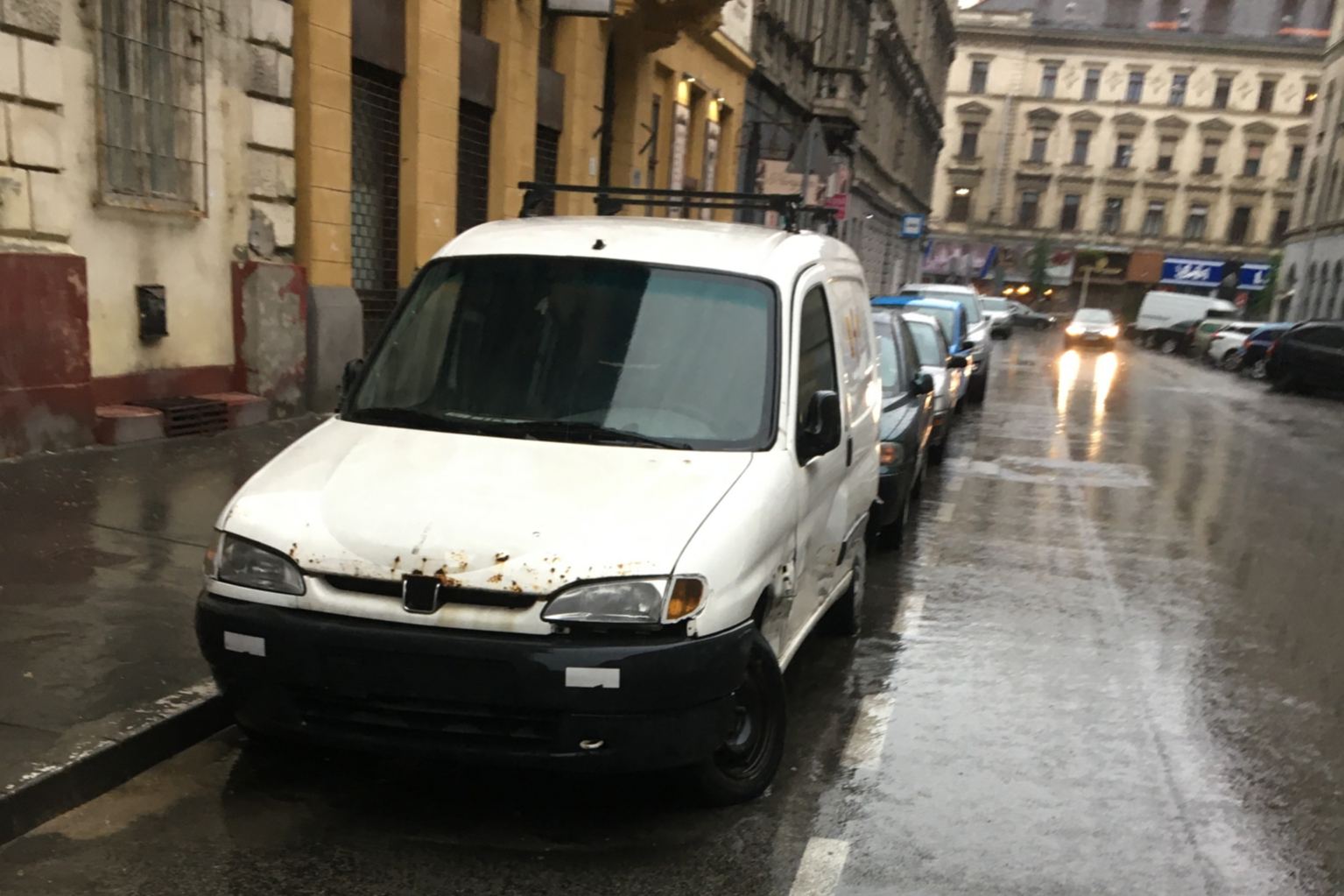 Kiss József utcában egy összetört Peugeot Partner áll.
