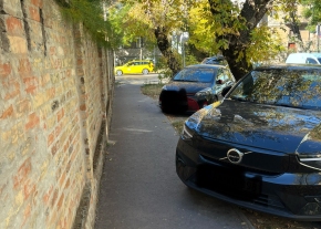 Teljesen tönkretették a zöldfelületet a parkoló autók. A facsemetékre teljesen ráálltak. Rendszeresen itt állnak, a Volvo szinte egész nap.
