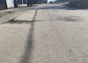 Szeptember elején valamilyen számomra ismeretlen okból munkások egy kb. 1.5m *1m területen kivágták az aszfaltot. Ezután csak kaviccsal tömték be, de nem aszfaltozták le. Azóta az autók a kavicsot kikotorták és egy kb 8 cm mély és éles szélű kátyú keletkezett. A kátyú az autókra, a kipattanó kövek a gyalogosokra veszélyesek.