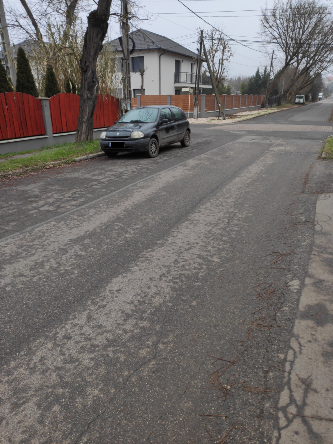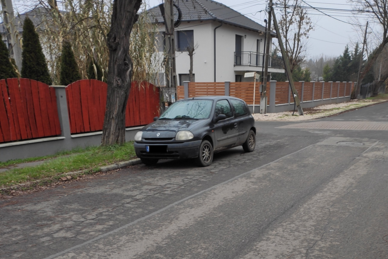 Reggeli órákban balesetveszélyesen parkoló autó, több mint 2 hete nem mozdul.