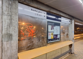 A Budaörsi út 91-nél, Budaörs irányában az #F02053 azonosítójú buszmegálló meletti villanyoszlop össze van firkálva.
