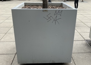 A Flórián téri aluljárónál üvegfallal elkerített, a római kori katonai medencéket bemutató területet körülvevő üvegfal tele van firkálva, tele van pókhálóval és az üveg is már régóta meg van karcolva, összemocskolva.