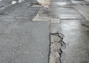A Mészáros József utcában, közvetlenül a Pilóta utca kereszteződés után egy egyre mélyülő kátyú éktelenkedik az úton.