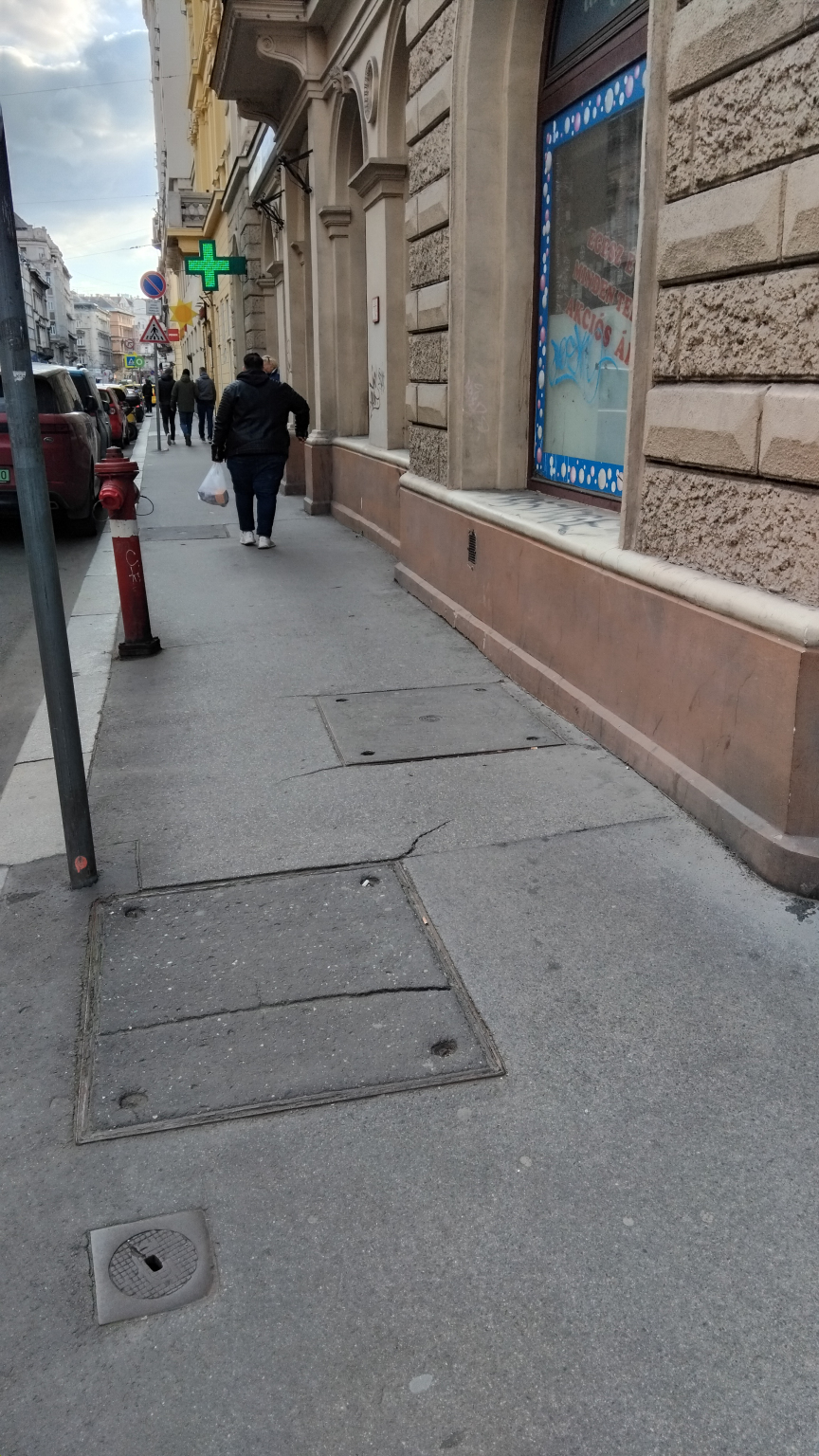 A Király utca 86. szám alatt található a képen látható aknafedél, ami beszakadt. Kérem, hogy a balesetveszély elhárítása érdekében cseréljék ki minél hamarabb. Köszönöm!