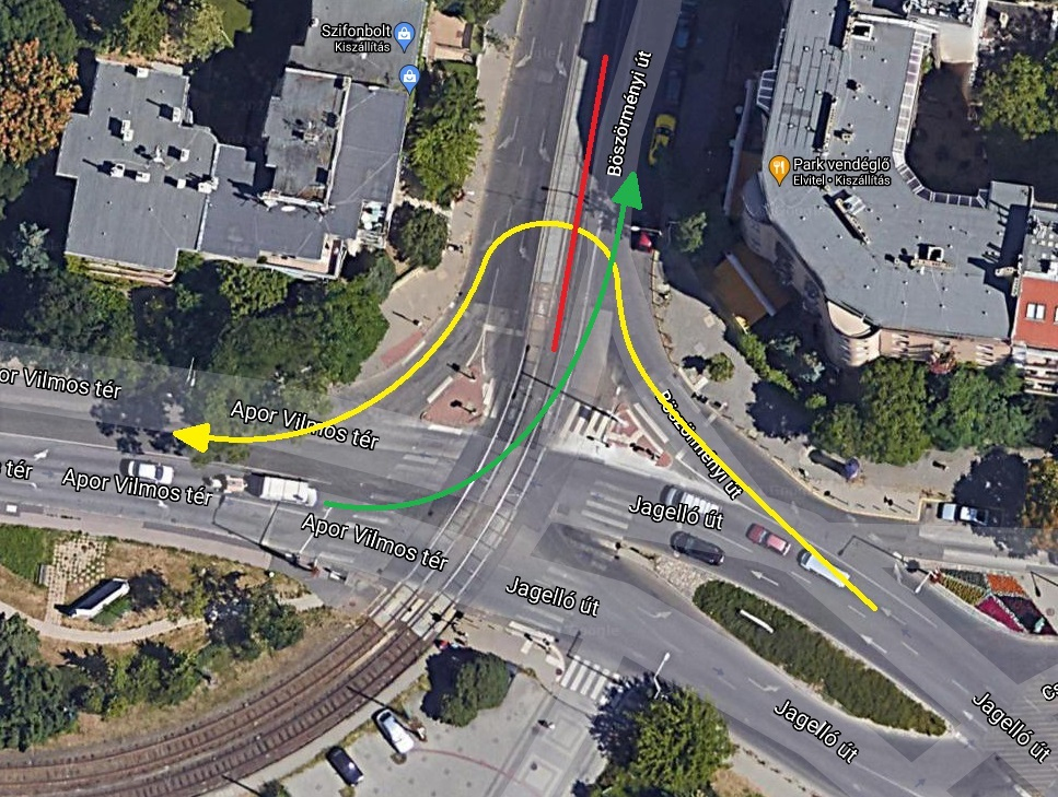 A Böszörményi út Apor Vilmos téri torkolatában az útpálya tengelyében történő visszafordulás szabálytalan, mivel a Csörsz utca f...