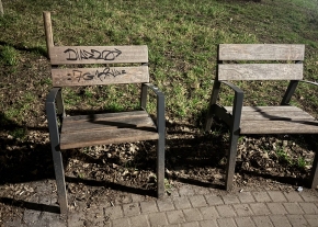 Hónapok óta firkás a bank oldala, azóta arrébb (ezt nem fényképeztem) egy kósza kis horogkeresztre is futotta. Jó lenne, ha letakaríttatnák a firkákat, köszönöm.