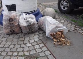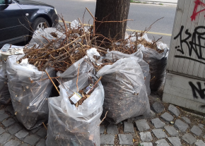 Elszállításra váró zöldhulladék-gyűjtő zsákok