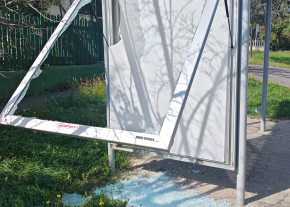 Buszmegálló hirdetőtábla betörve, szilánkok a megállóban