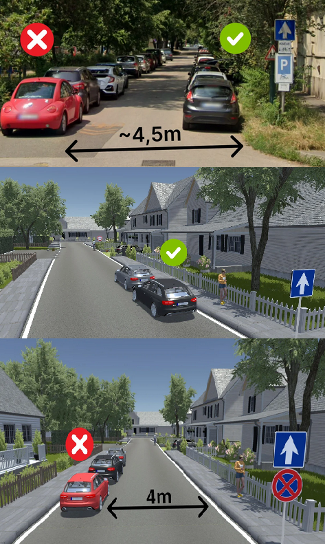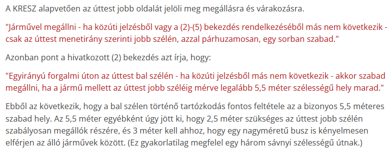 "Egyirányú forgalmi úton az úttest bal szélén - ha közúti jelzésből más nem következik - akkor szabad megállni, ha a jármű mellett az úttest jobb széléig mérve legalább 5,5 méter szélességű hely marad."