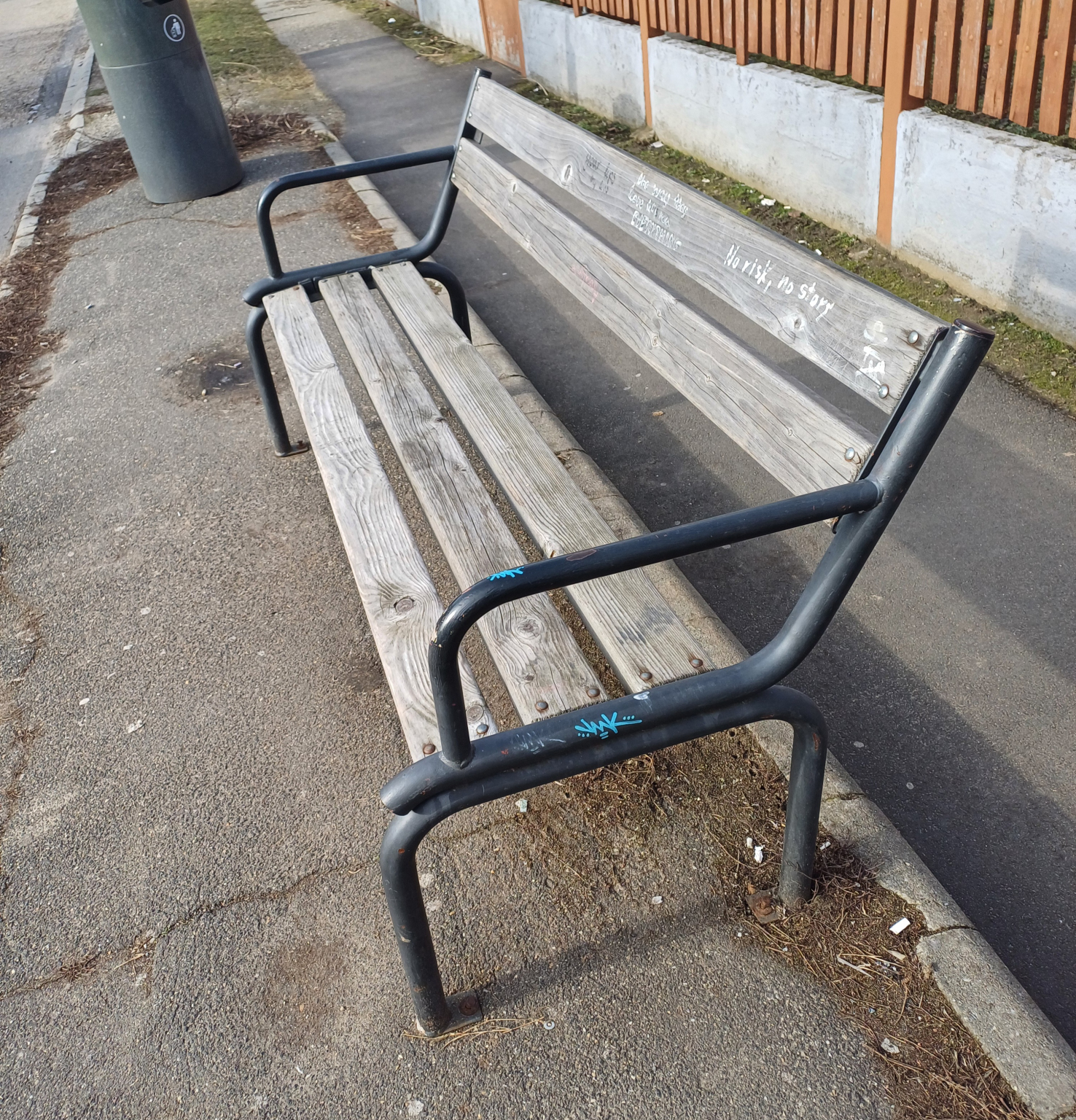 A 34-es busz Rózsás Csárda megállójában hiányzik egy léc a padból.