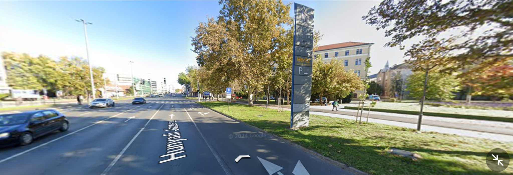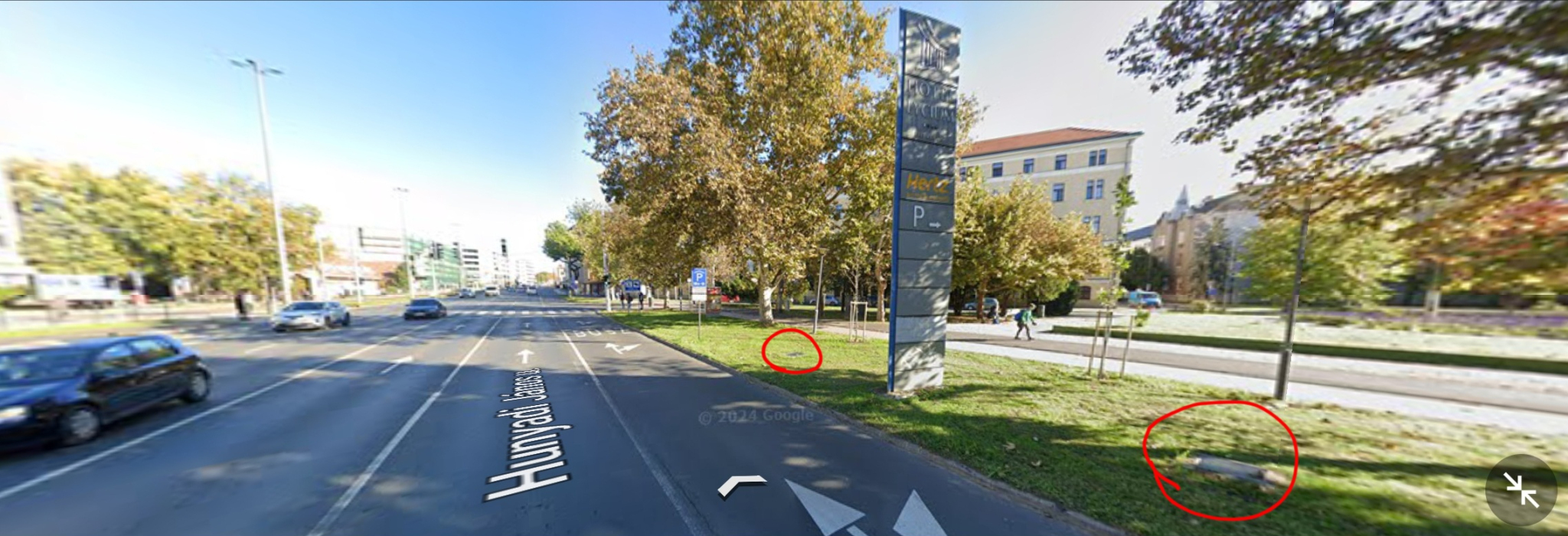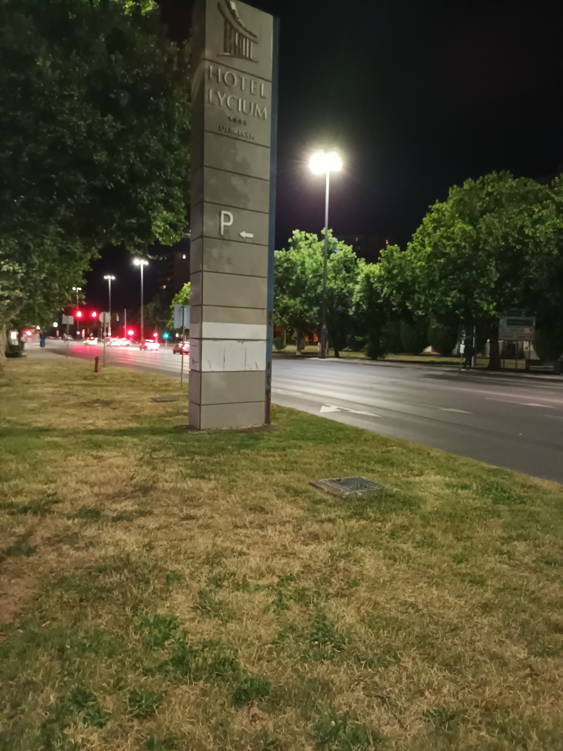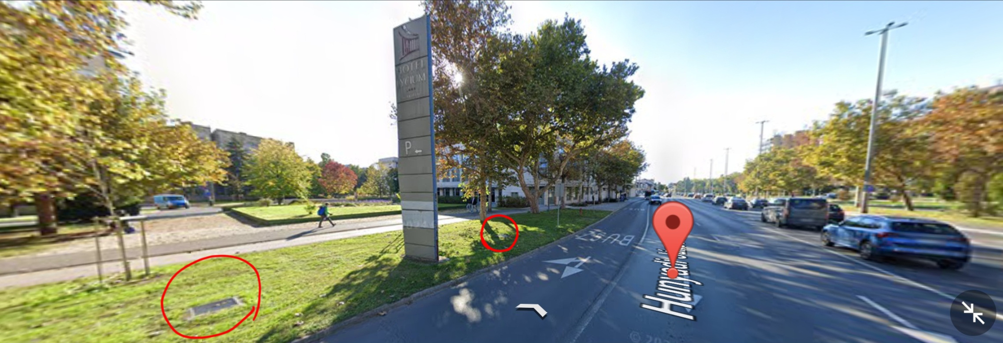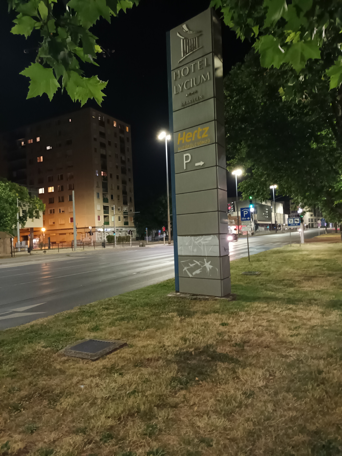 A Hunyadi János utcán a Hotel Lycium oldalában a Hotel Lyciumot hirdető oszlopnak a talajba süllyesztett reflektoros világítása nem működik.