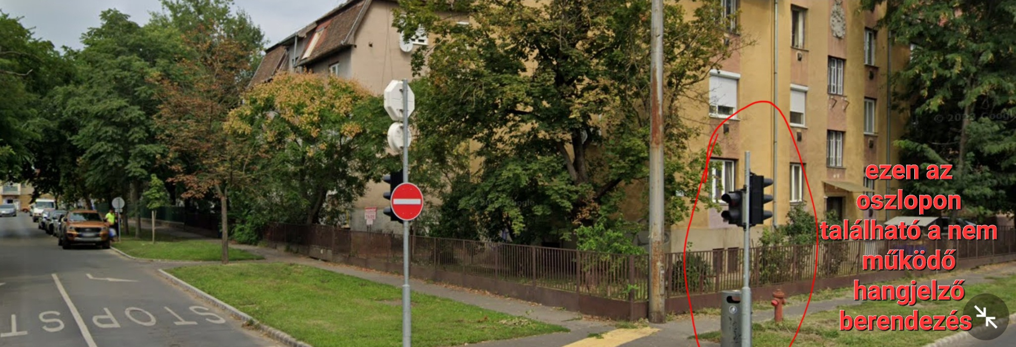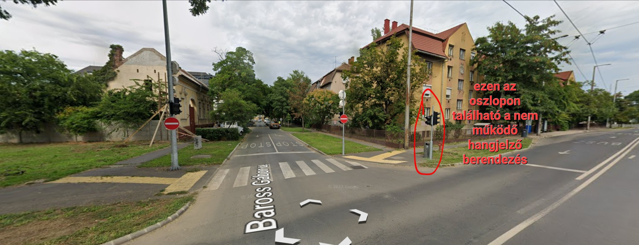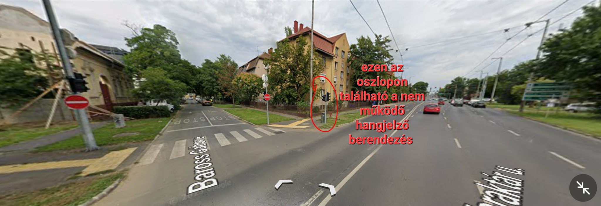A Faraktár utca és a Baross utca kereszteződésében a Faraktár utca páros házszámozású oldalában lévő jelző lámpás gyalogos átkelőhelyen a vakokat és gyengén látókat a szabad jelzésről tájékoztató két hangjelző berendezés közül az egyik nem működik.