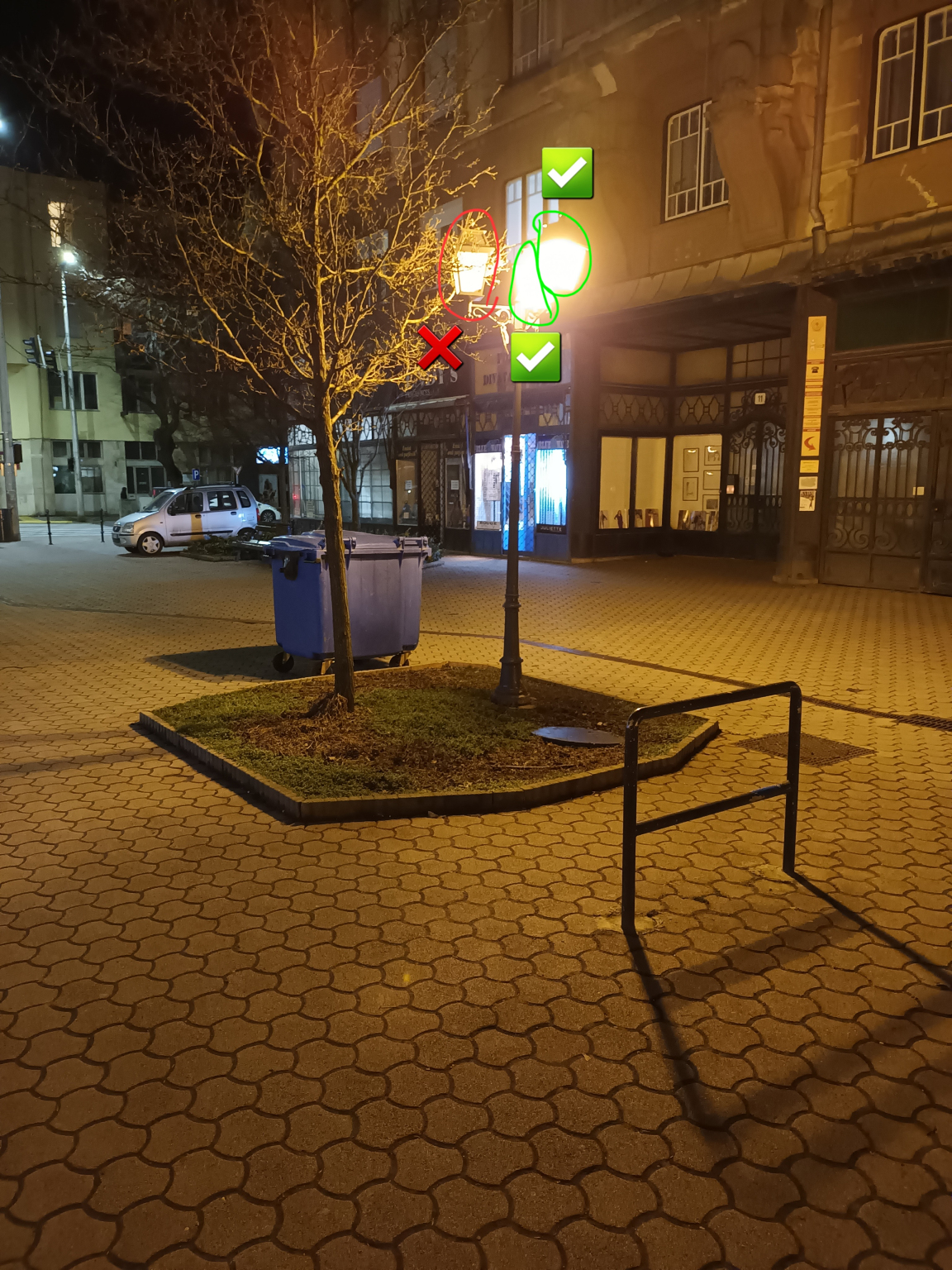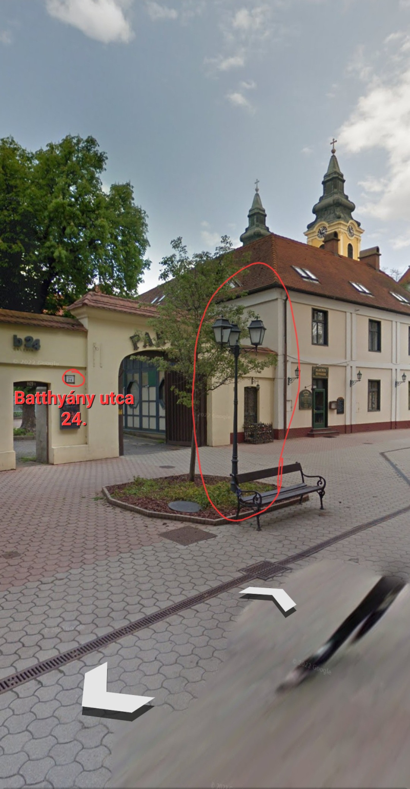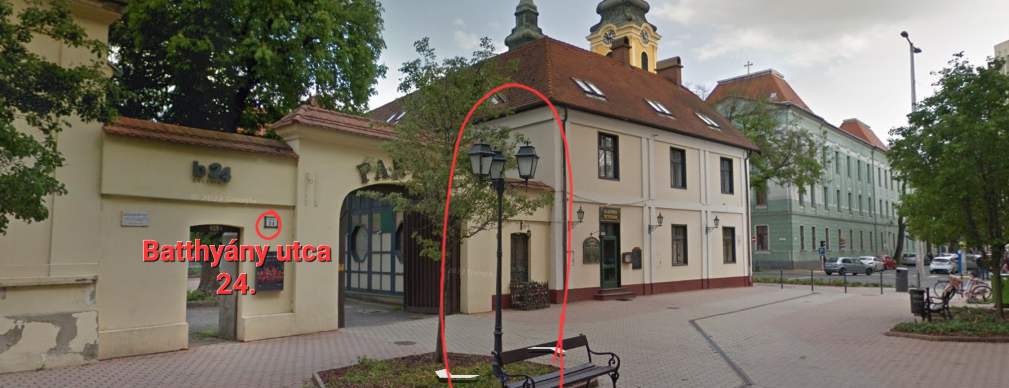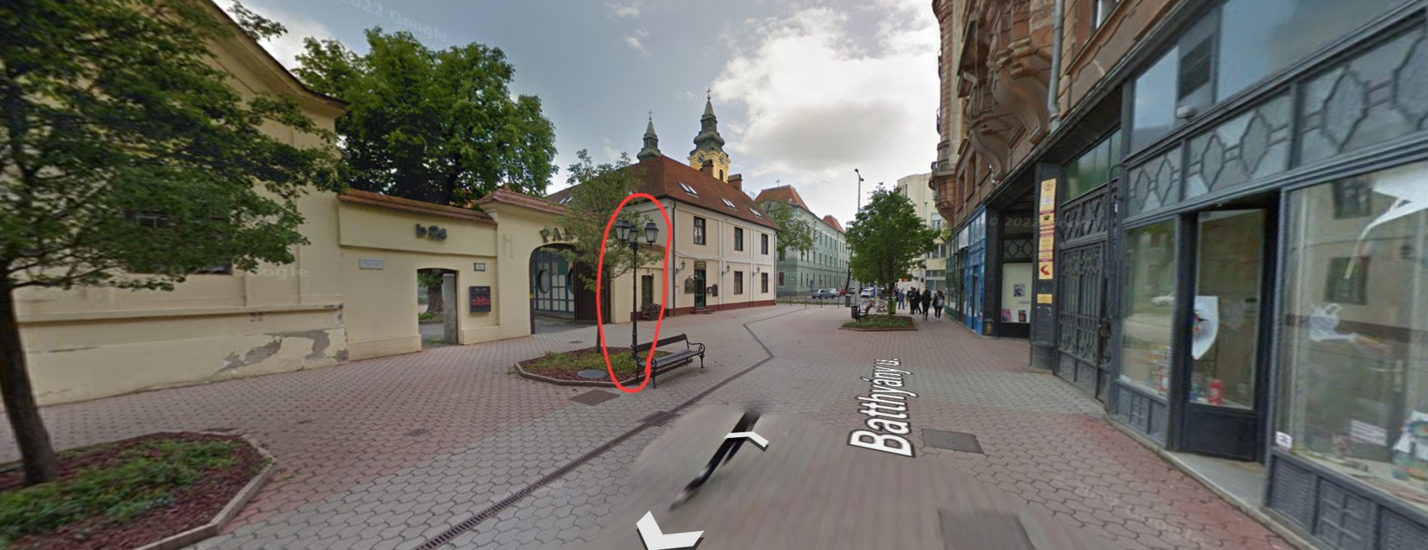 A Batthyány utca 24. szám (B24 Galéria) közelében lévő 3 lámpás közvilágítás egyik lámpája nem világít.
