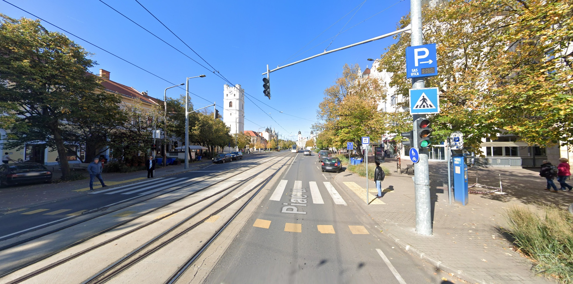 A Piac utca 43/A-t és a Piac utca 43/B-t a Piac utca 28/C-vel összekötő kijelölt gyalogos átkelőhely egyik Kresz táblája nem világít.
