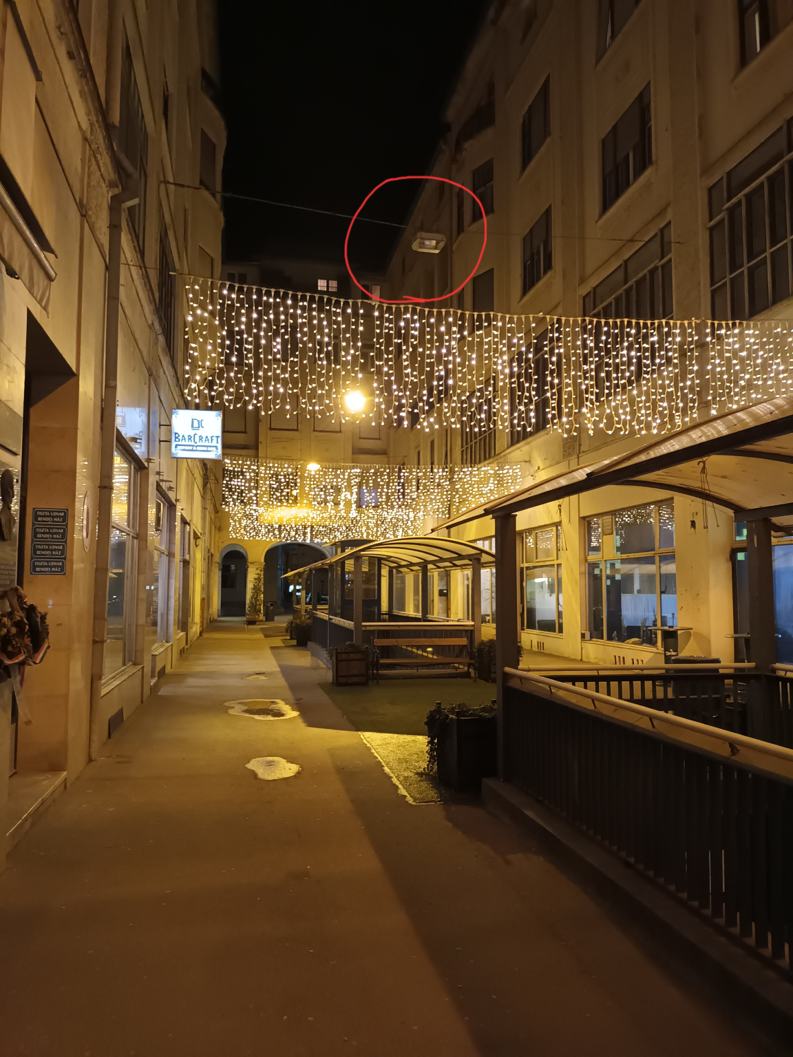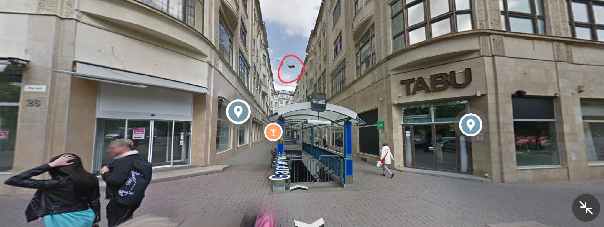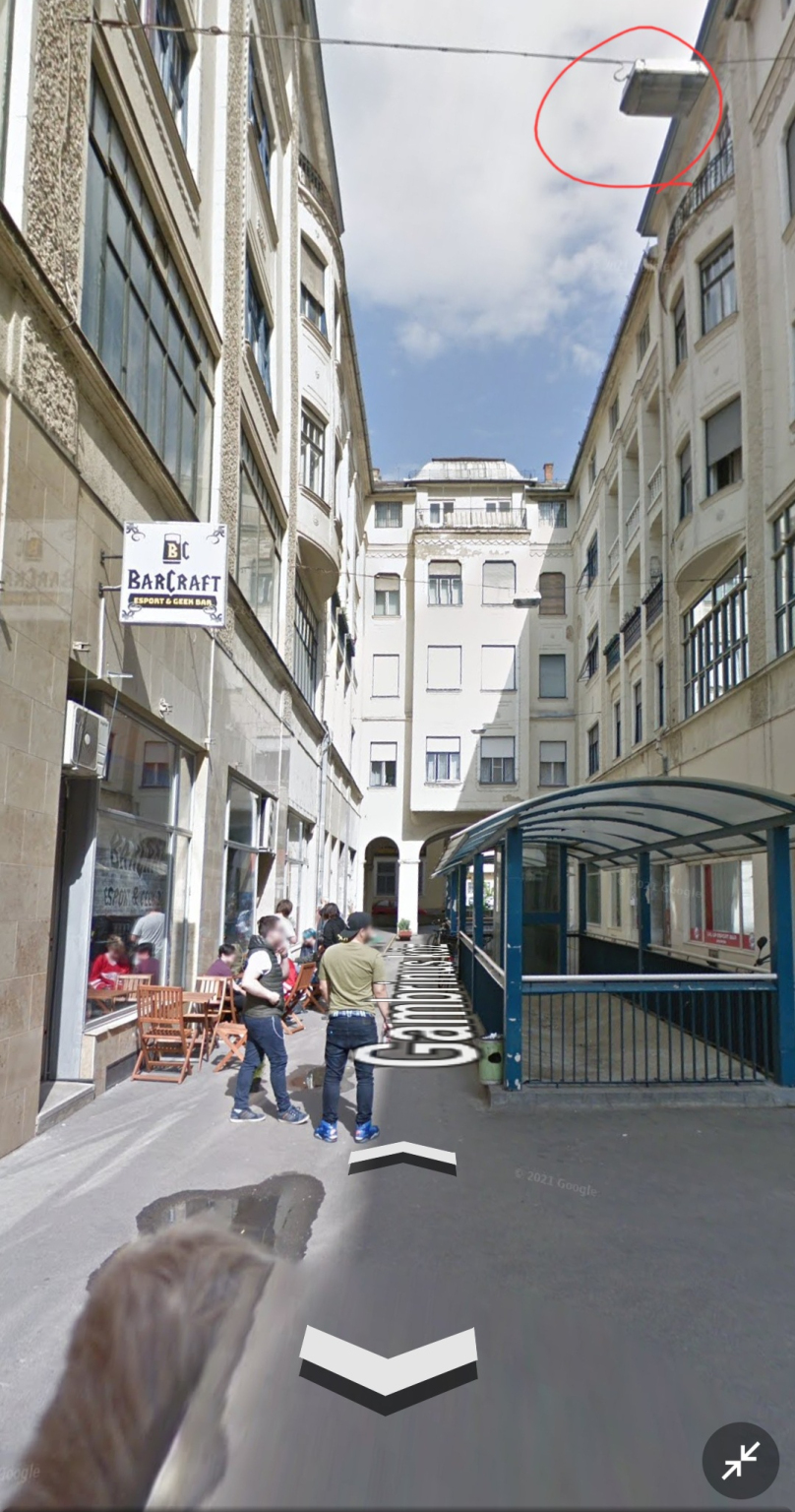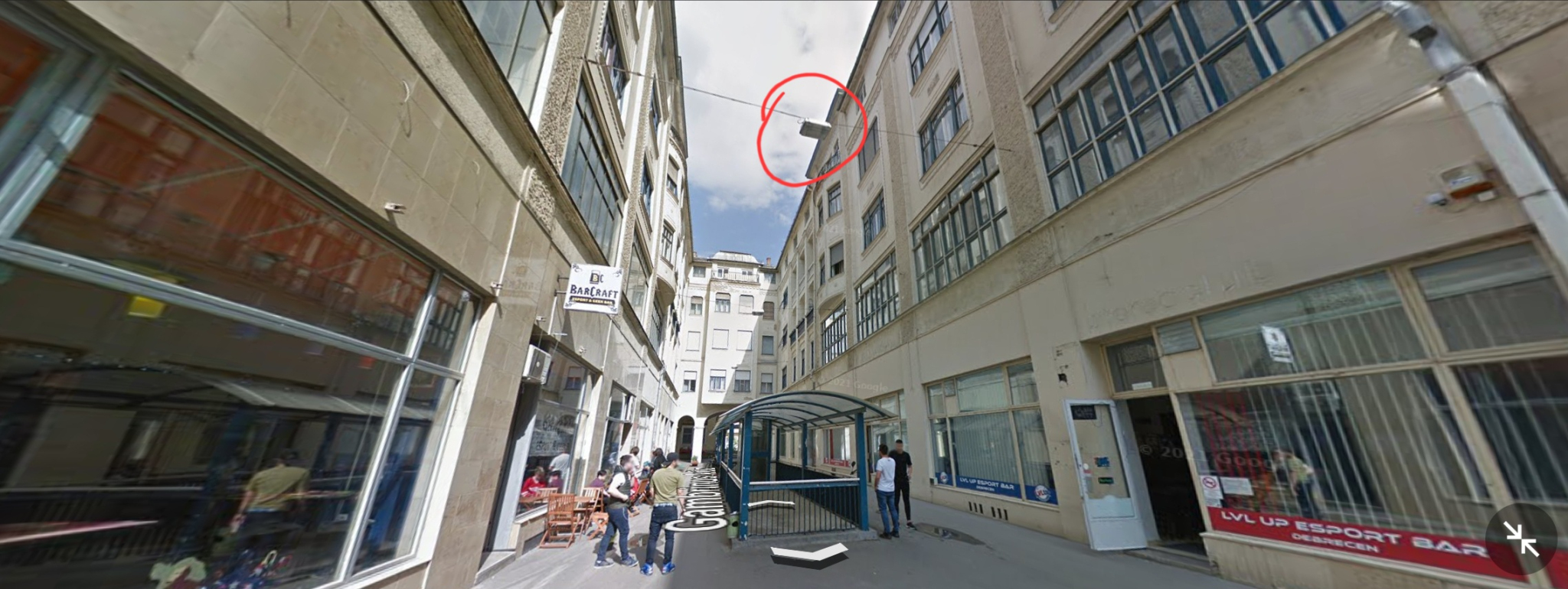A Gambrinusz köz Piac utca felőli végétől haladva az első útátfeszítés gyengén fehéren világít, a harmadik pedig nem világít.