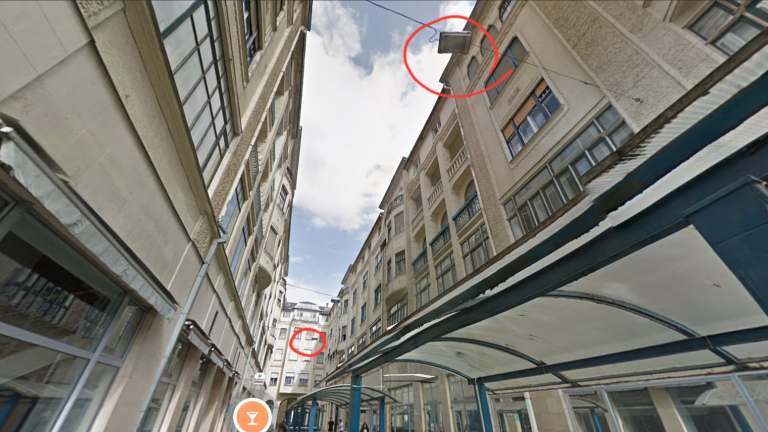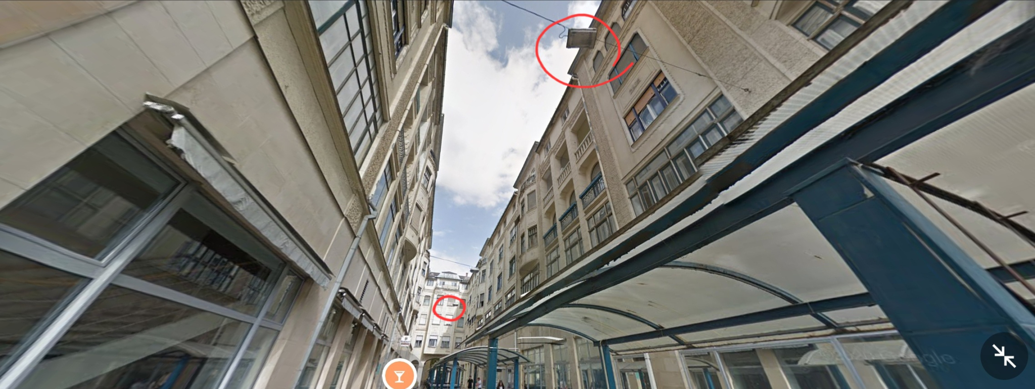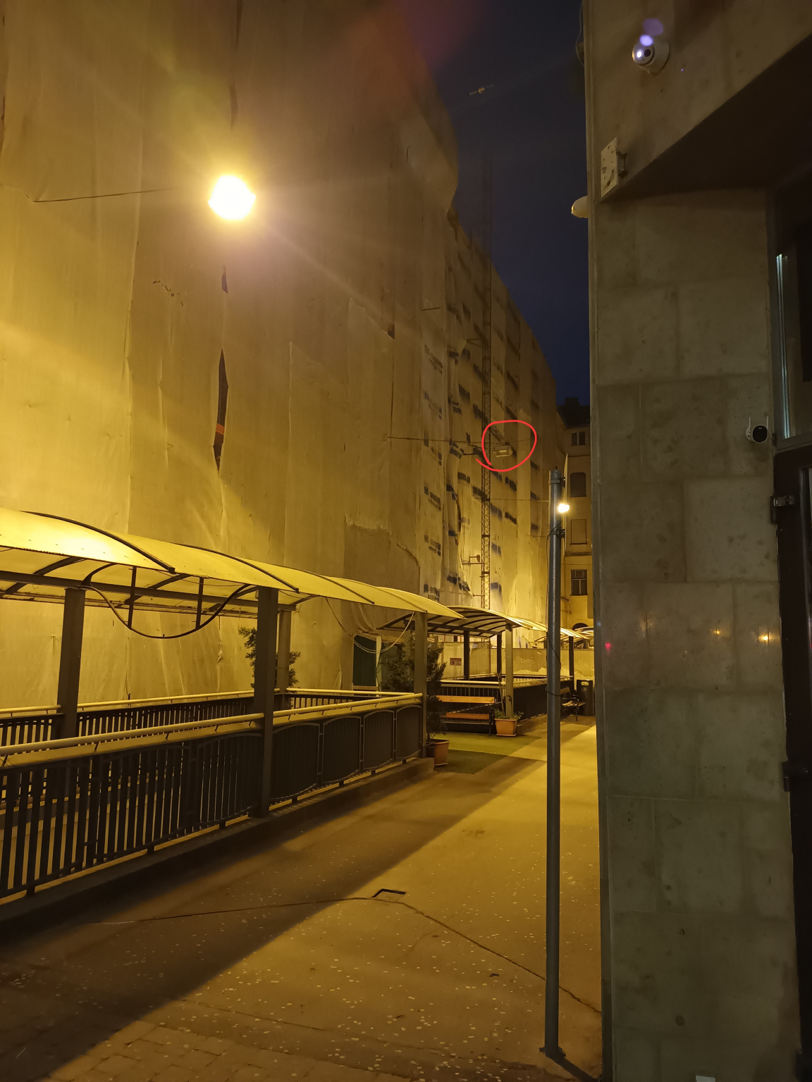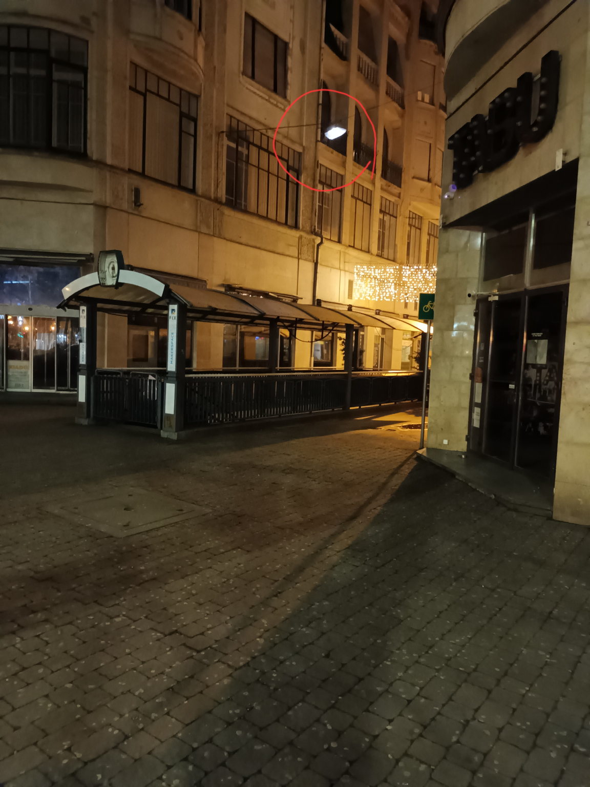 A Gambrinusz köz Piac utca felőli végétől haladva az első útátfeszítés gyengén fehéren világít, a harmadik pedig nem világít.
