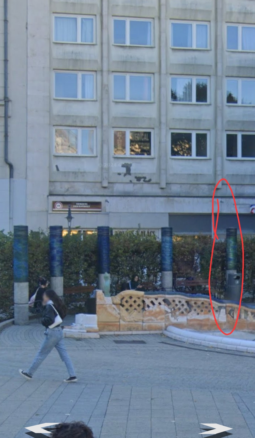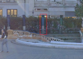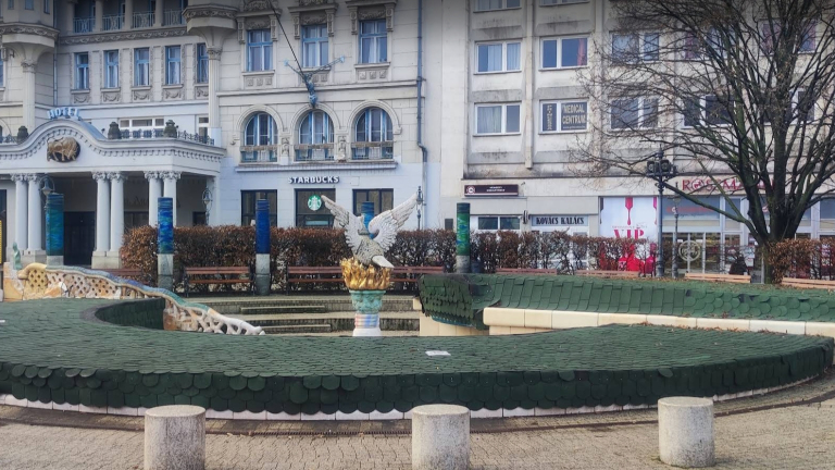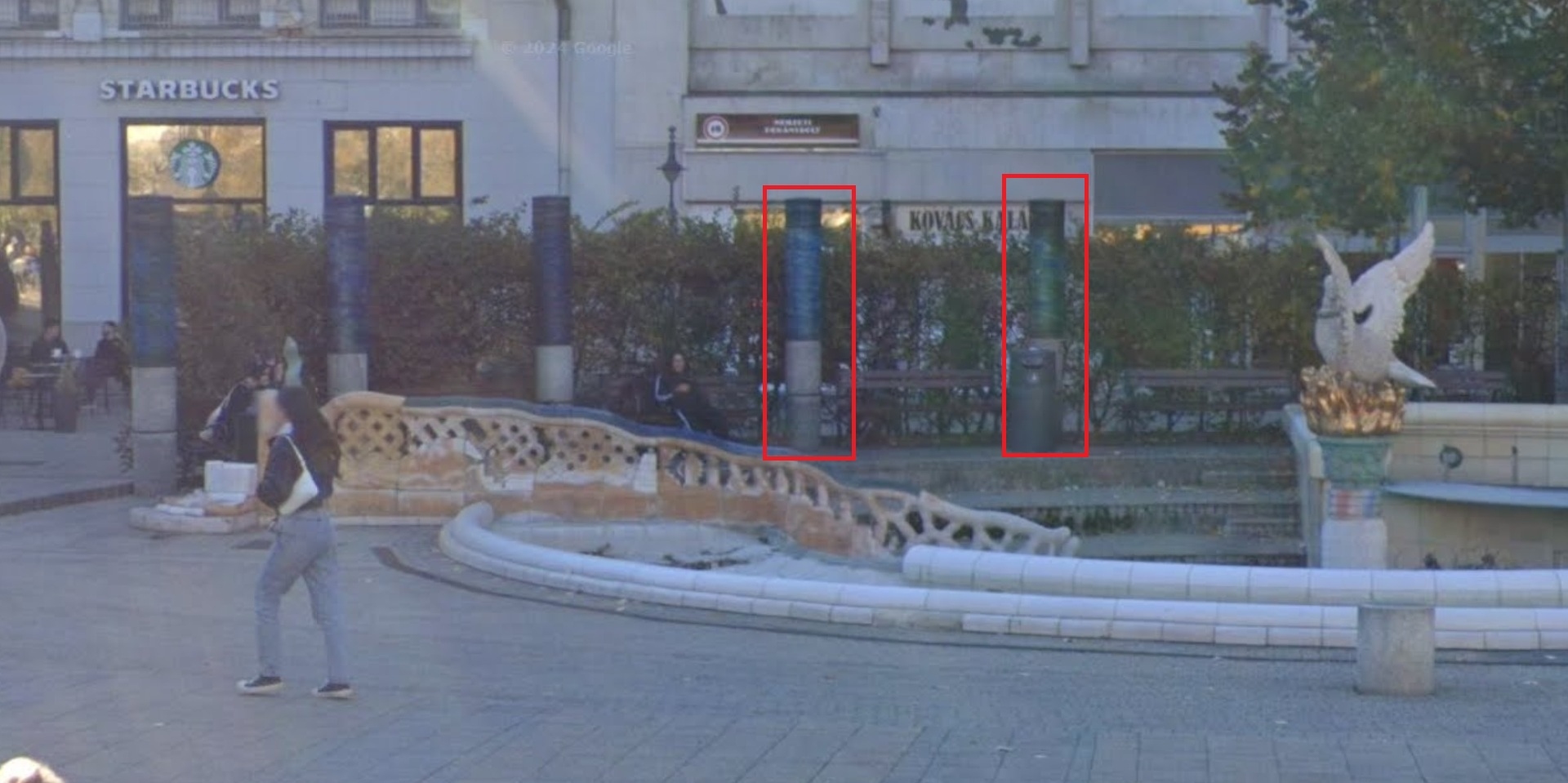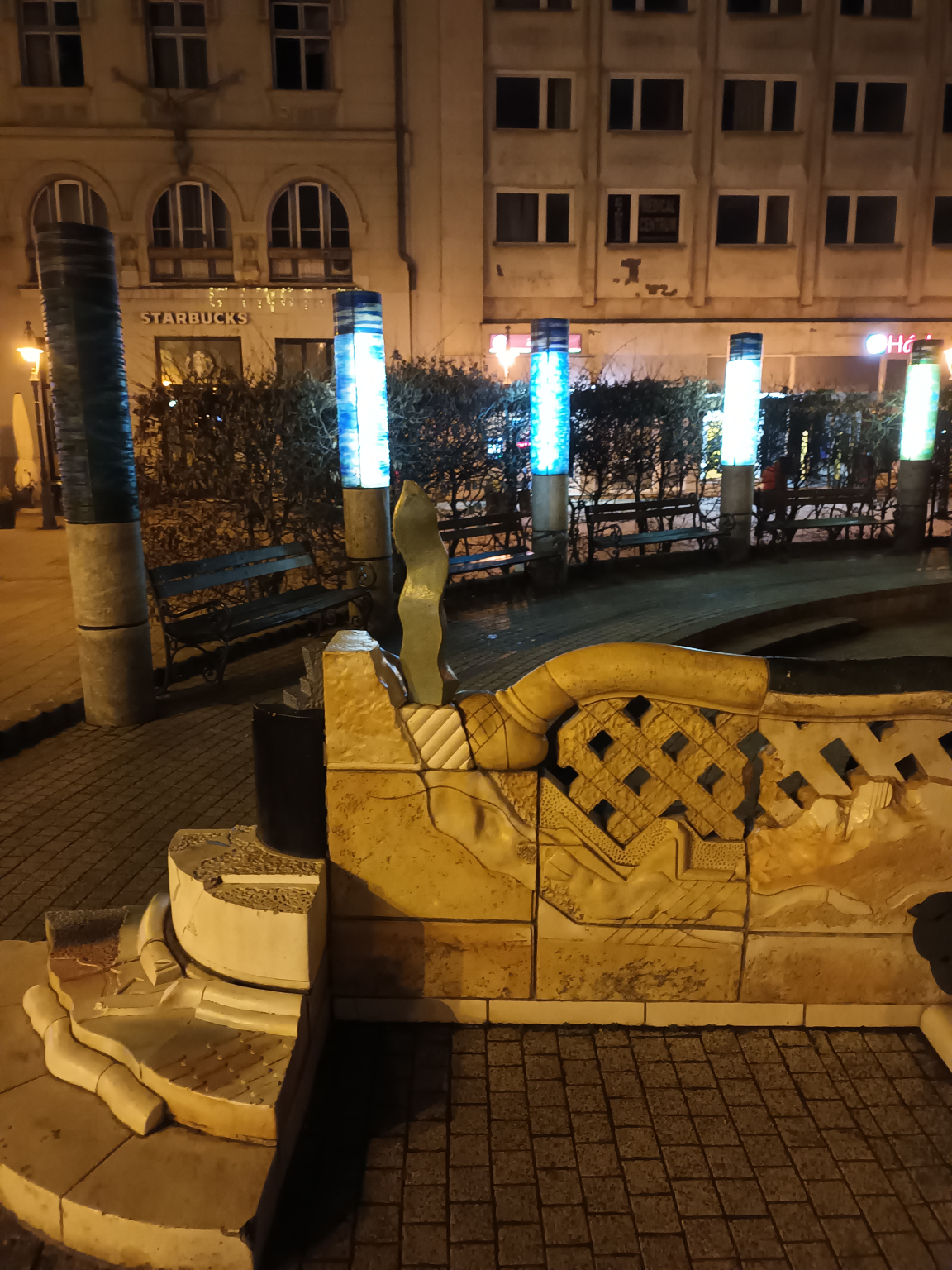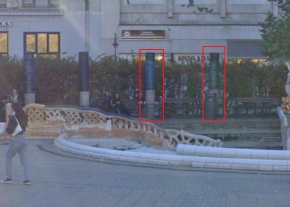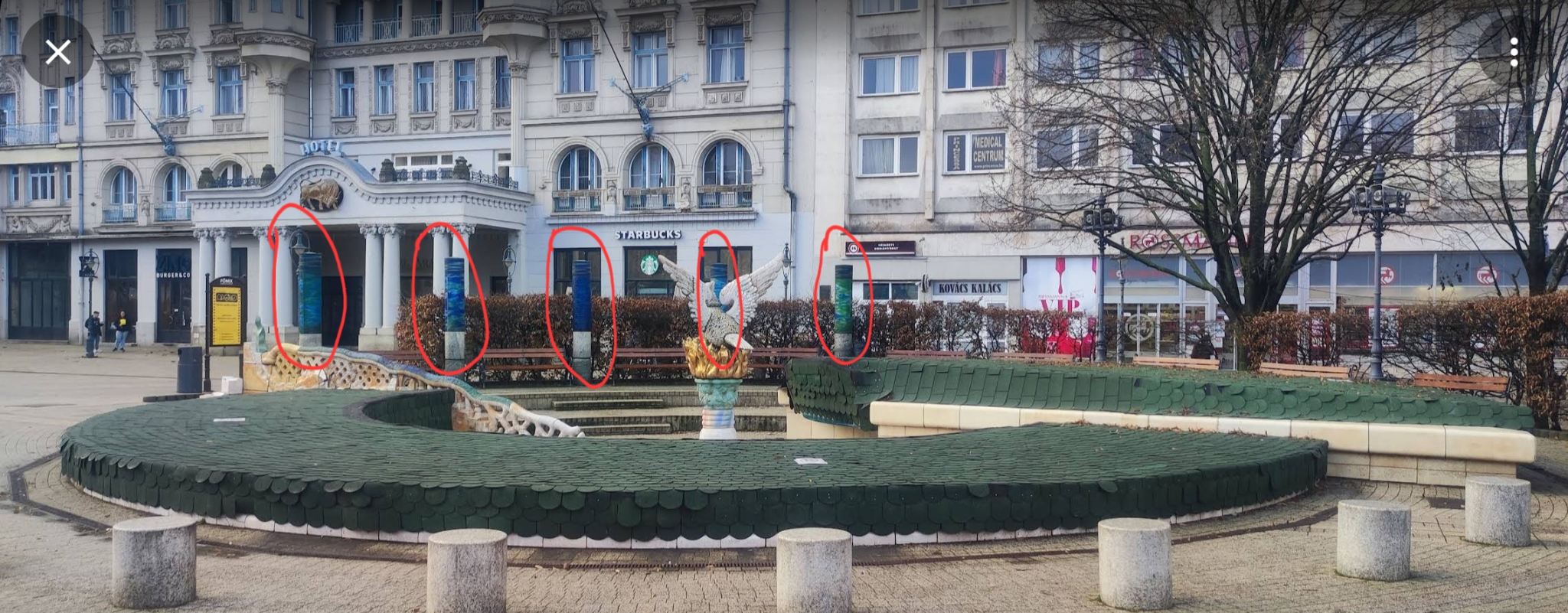 A Hotel Aranybika előtti szökőkút körüli 5 világító hengeroszlop közül az egyiknek nem működik a világítása, a többi négynek márcsak 1-1 fénycsöve világít.