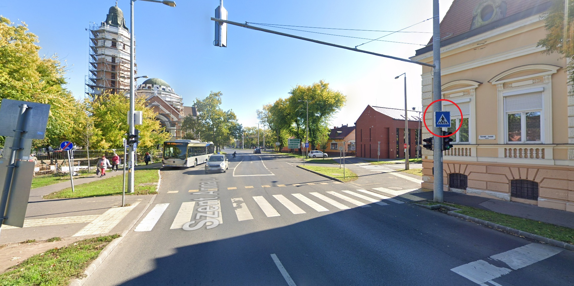 A Szent Anna utca 57. szám közelében lévő kijelölt gyalogos átkelőhely egyik Kresz táblájának a világítása nem működik.