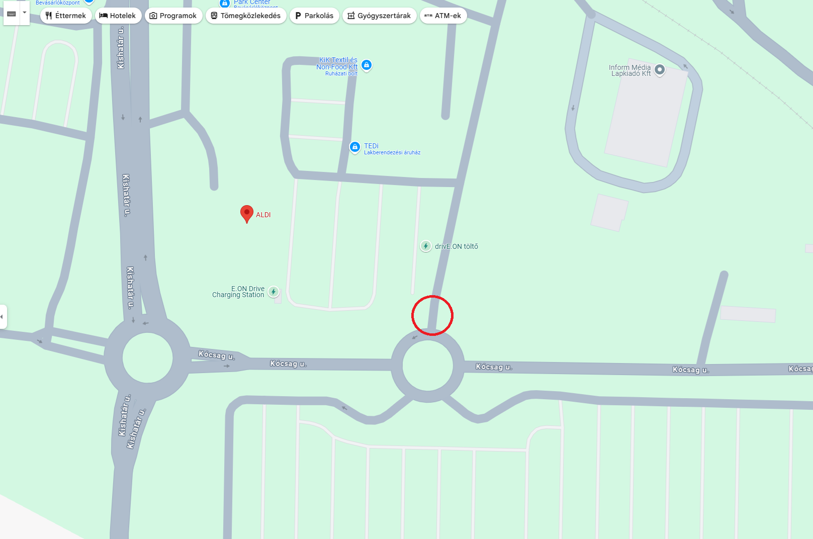 A Debrecen, Kishatár utcai Aldi melletti körforgalomnál található útszakaszon (a mellékelt képen megjelölt helyen) egy jelentős méretű kátyú található. A kátyú rendkívül kedvezőtlen helyen van, kikerülése nehézkes, különösen szembejövő forgalom esetén.