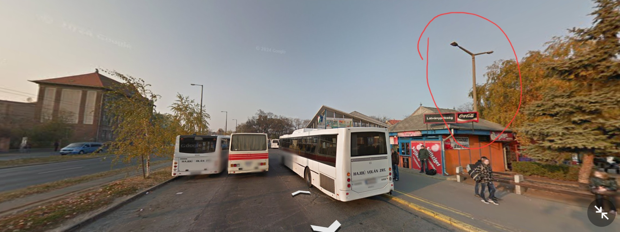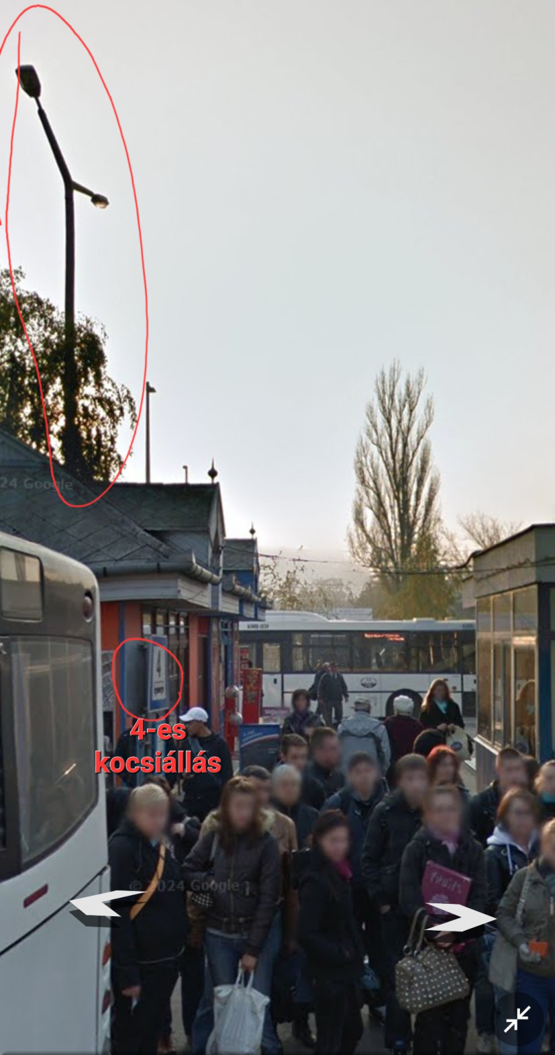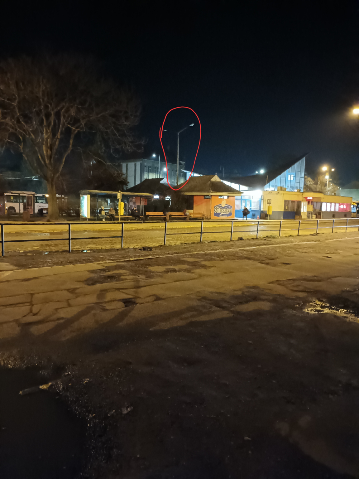 A Külsővásártéri Autóbuszállomás épületéhez legközelebbi, a 4-es kocsiállás közelében lévő, kétkarú közvilágító lámpaoszlop nem világít.