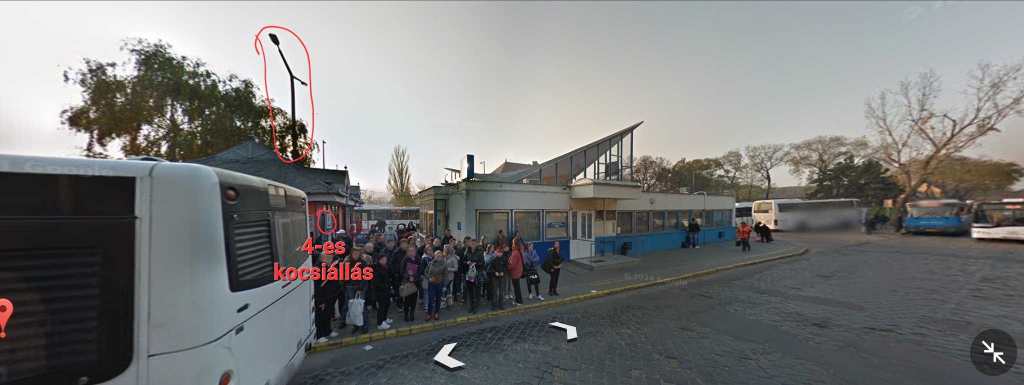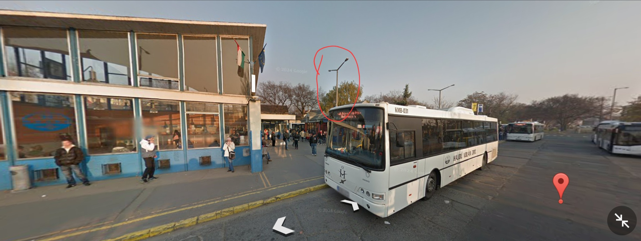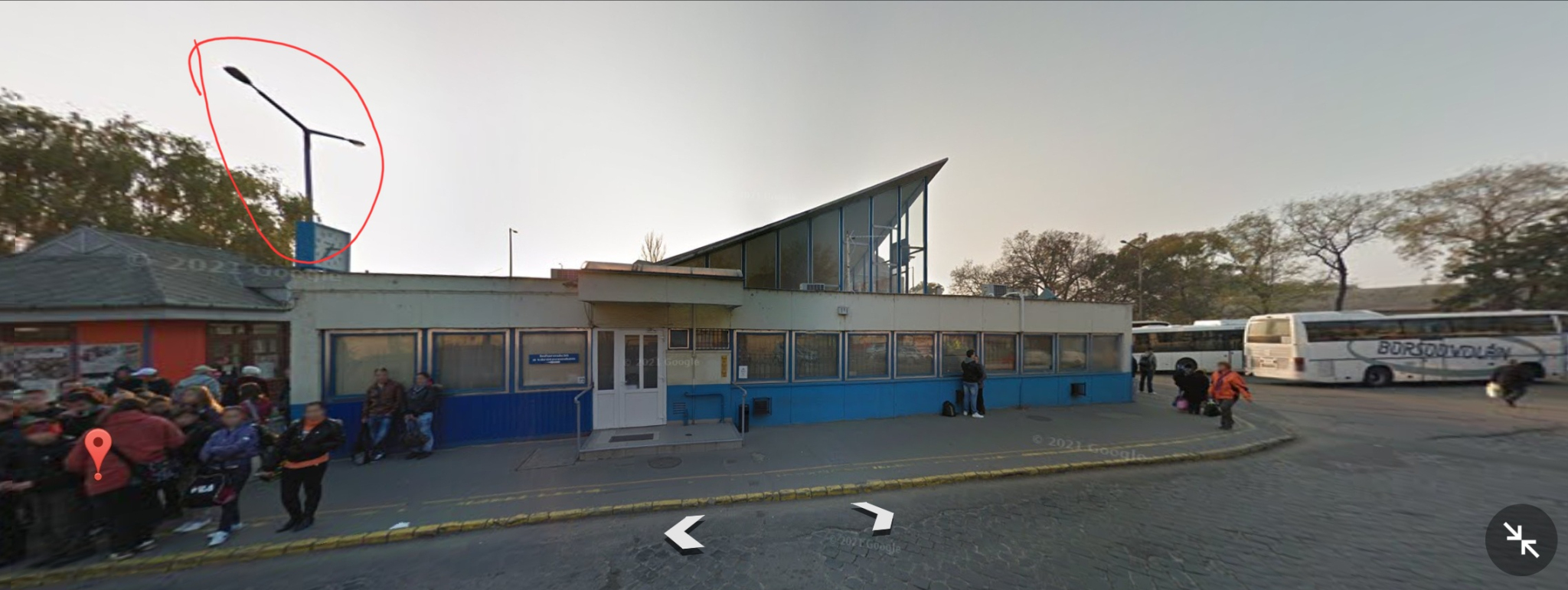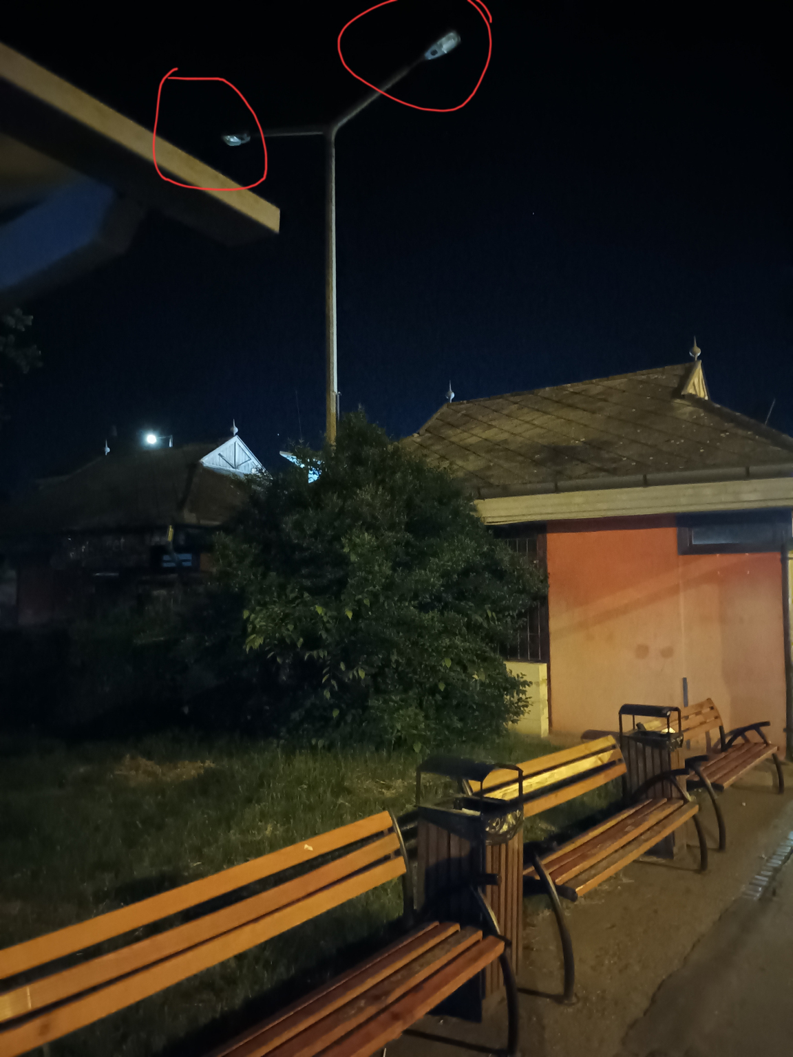 A Külsővásártéri Autóbuszállomás épületéhez legközelebbi, a 4-es kocsiállás közelében lévő, kétkarú közvilágító lámpaoszlop nem világít.