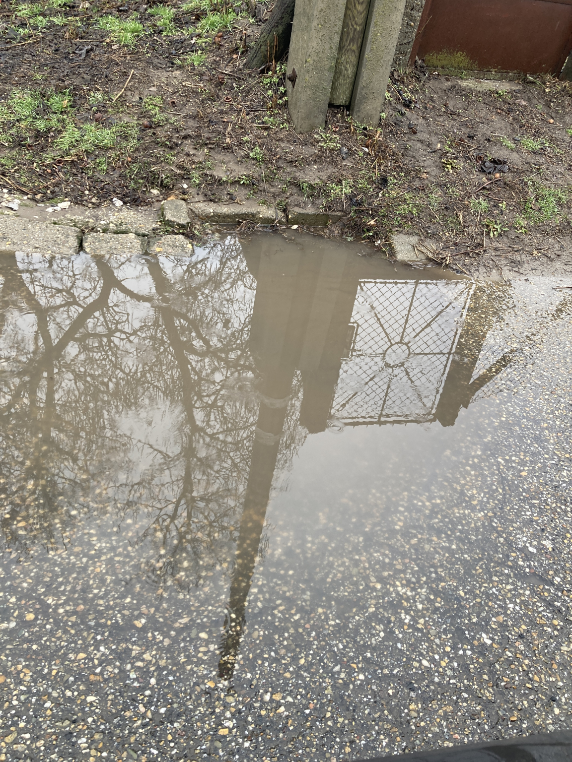 A Gergely utca - Gesztenye utca sarkán, a 21 számmal szemben található víznyelő eldugult, a fél úttest járhatatlan.