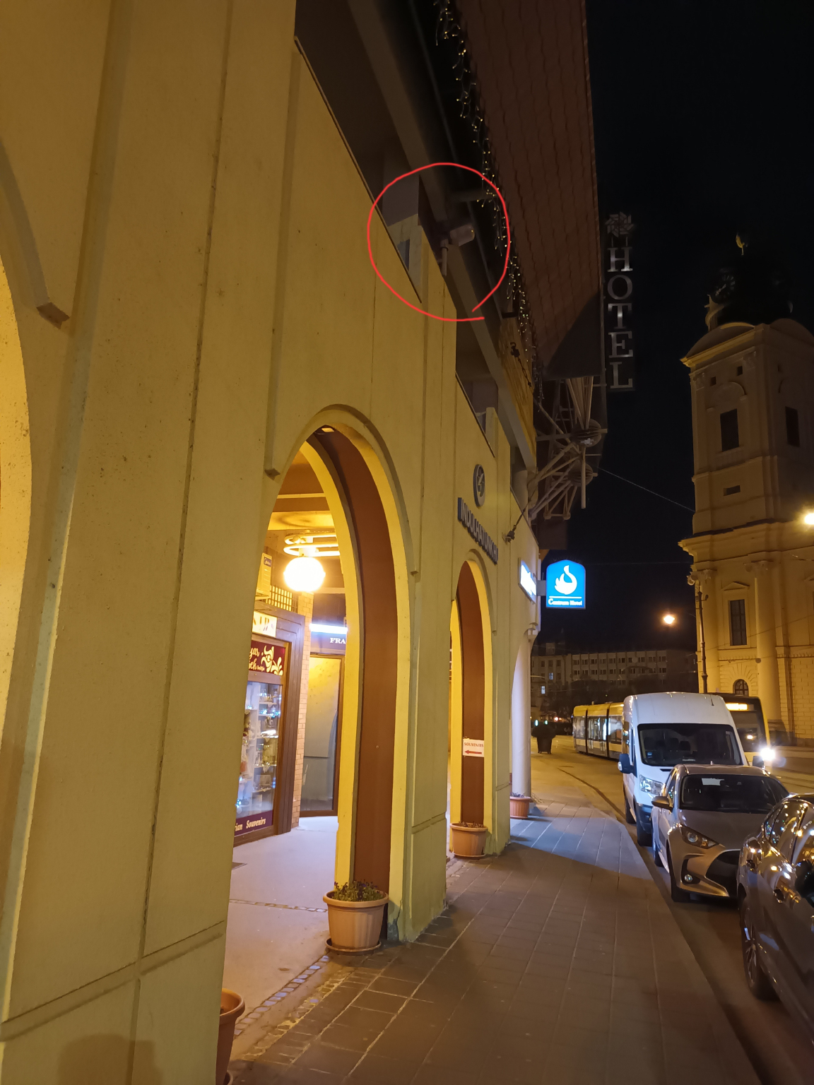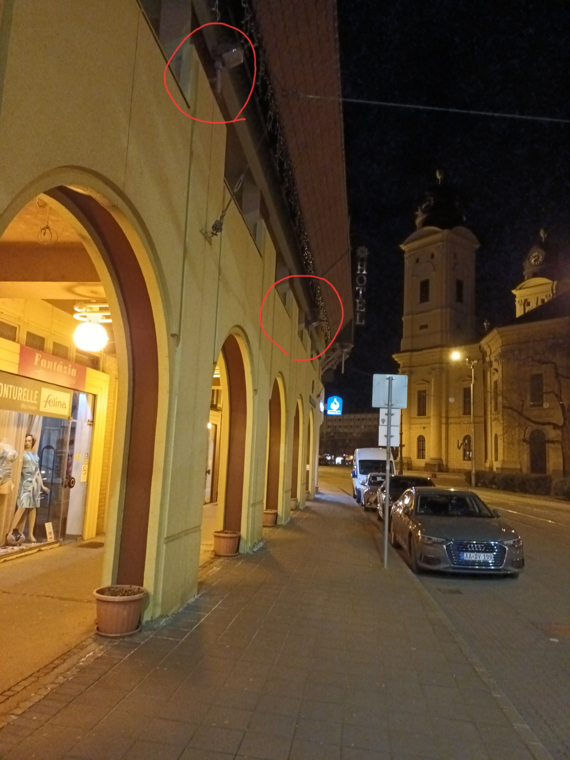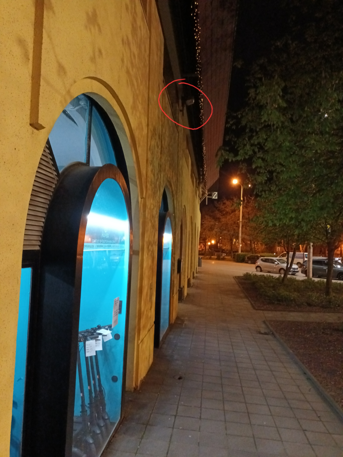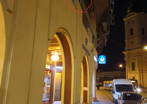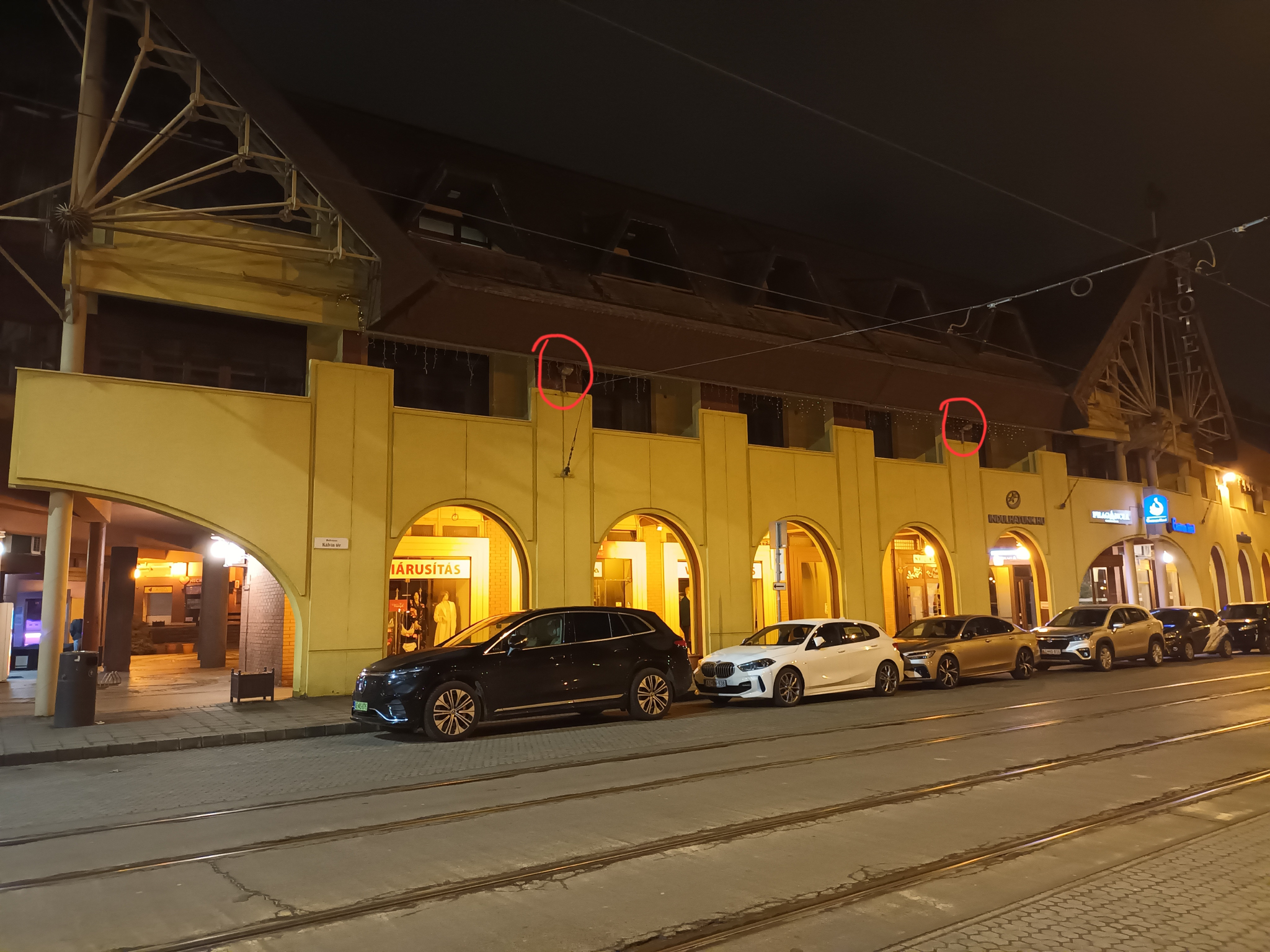 A Kálvin téri Udvarház épületének a villamossínekre néző oldalán lévő 4 egymásutáni falikar nem világít.