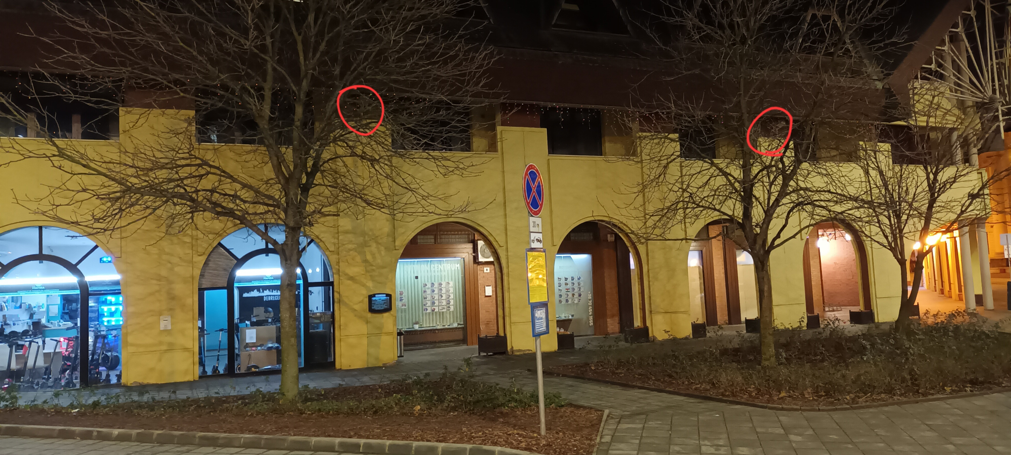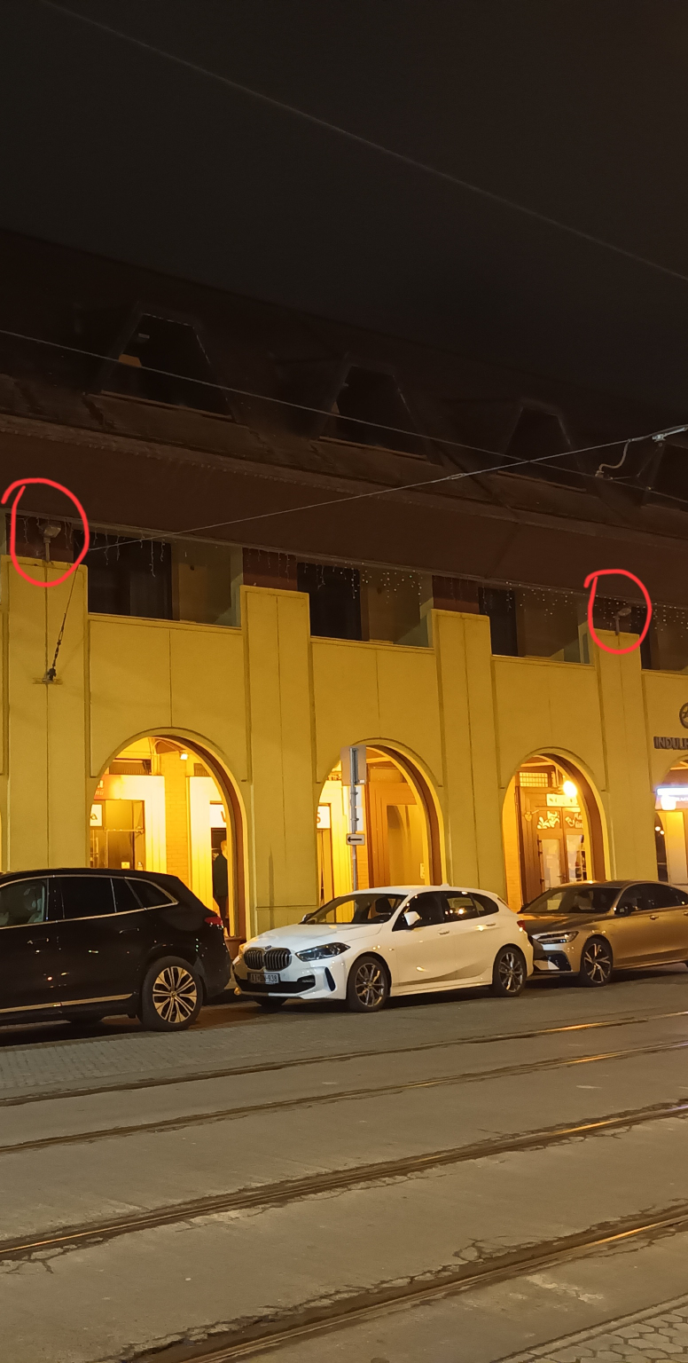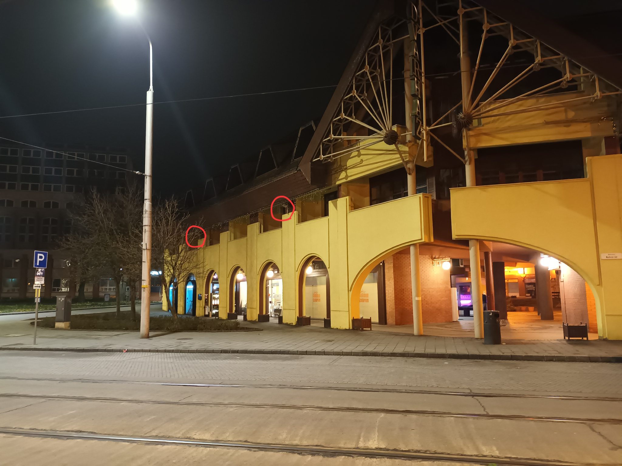 A Kálvin téri Udvarház épületének a villamossínekre néző oldalán lévő 4 egymásutáni falikar nem világít.
