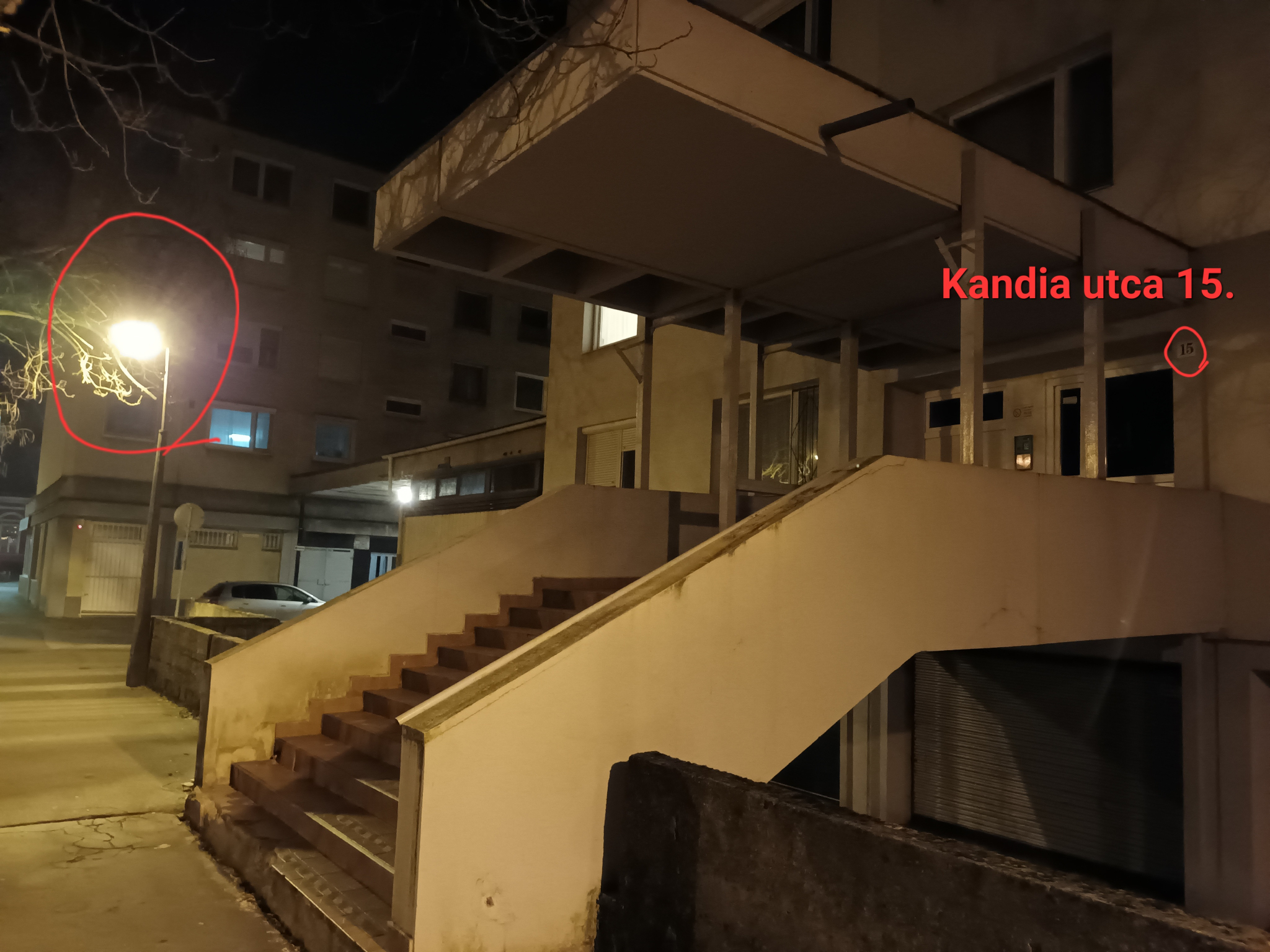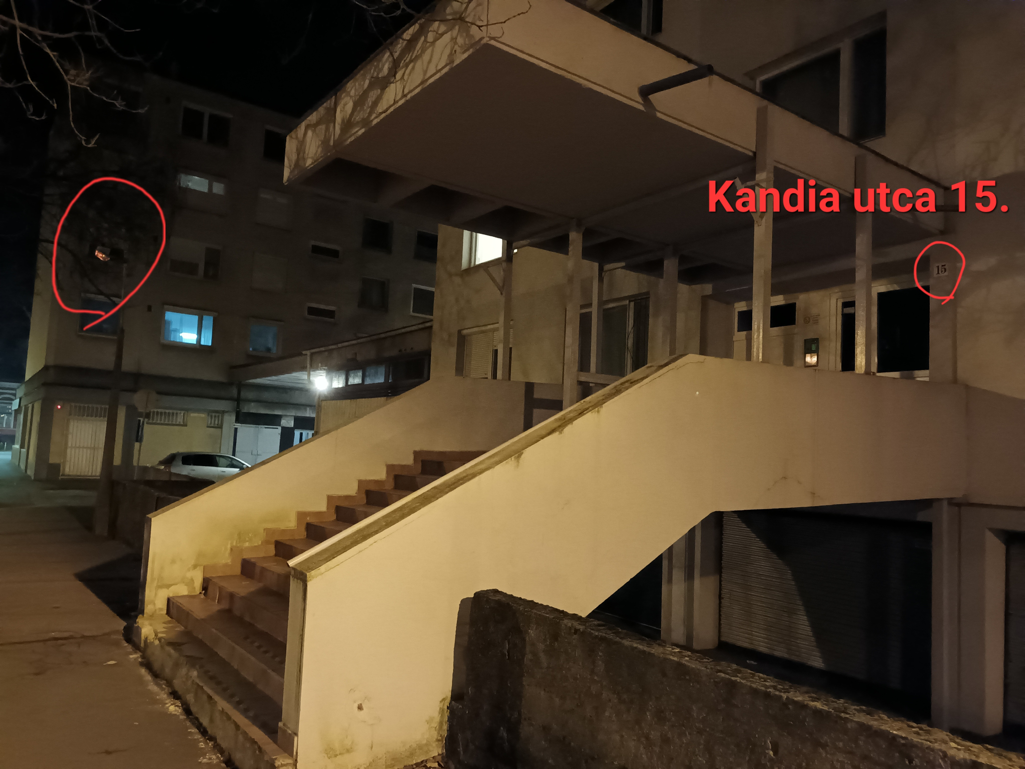 A Kandia utca 15. szám alatti lépcsőház bejárata közelében lévő lámpaoszlop világítása ki-bekapcsol.