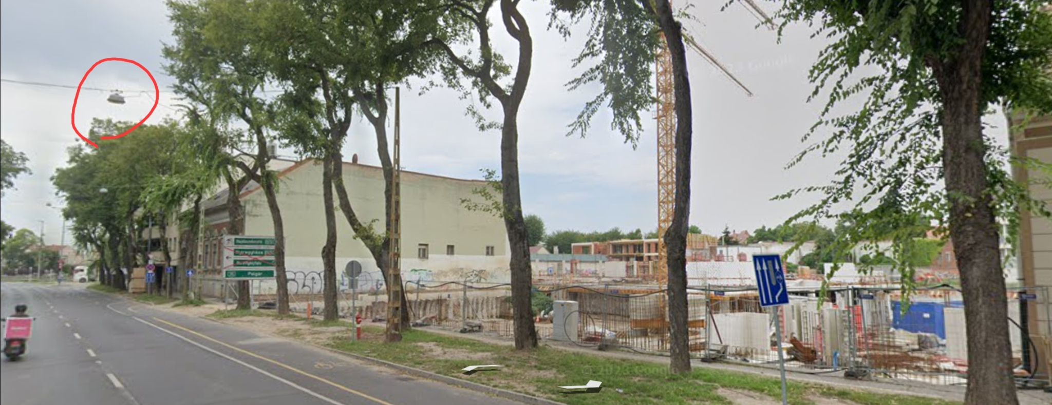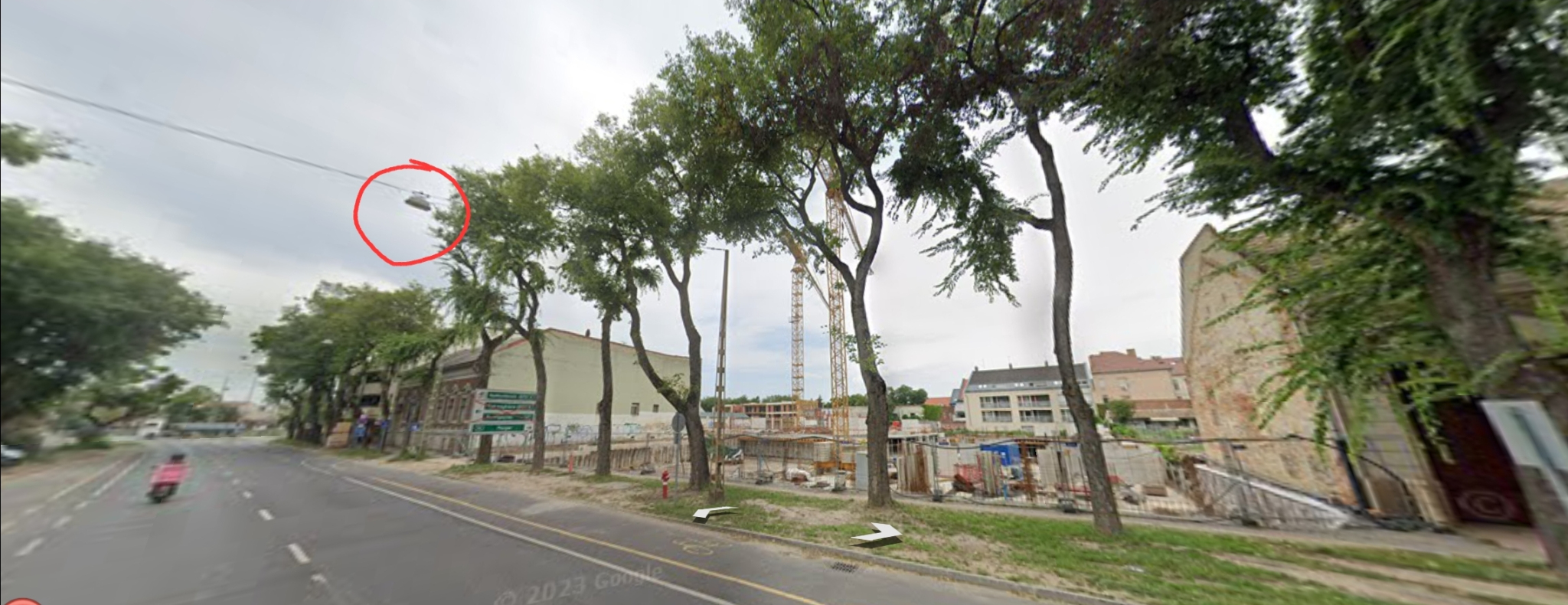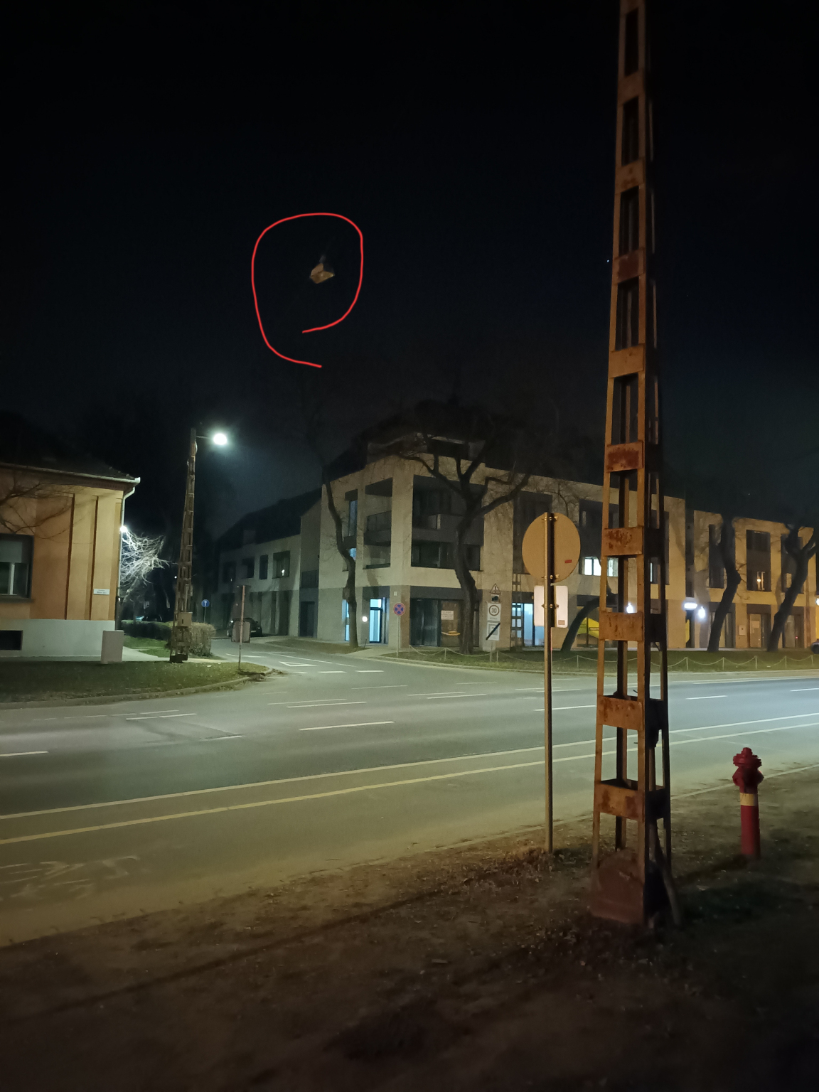 A fényképek és a leírás alapján egy lámpatest nem működik: nem lámpaoszlopon, hanem az út felett átfeszített kábelen található.