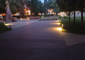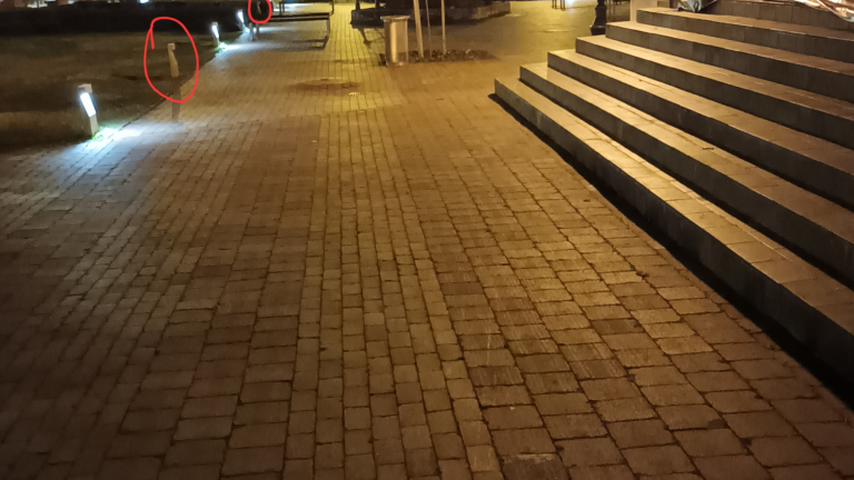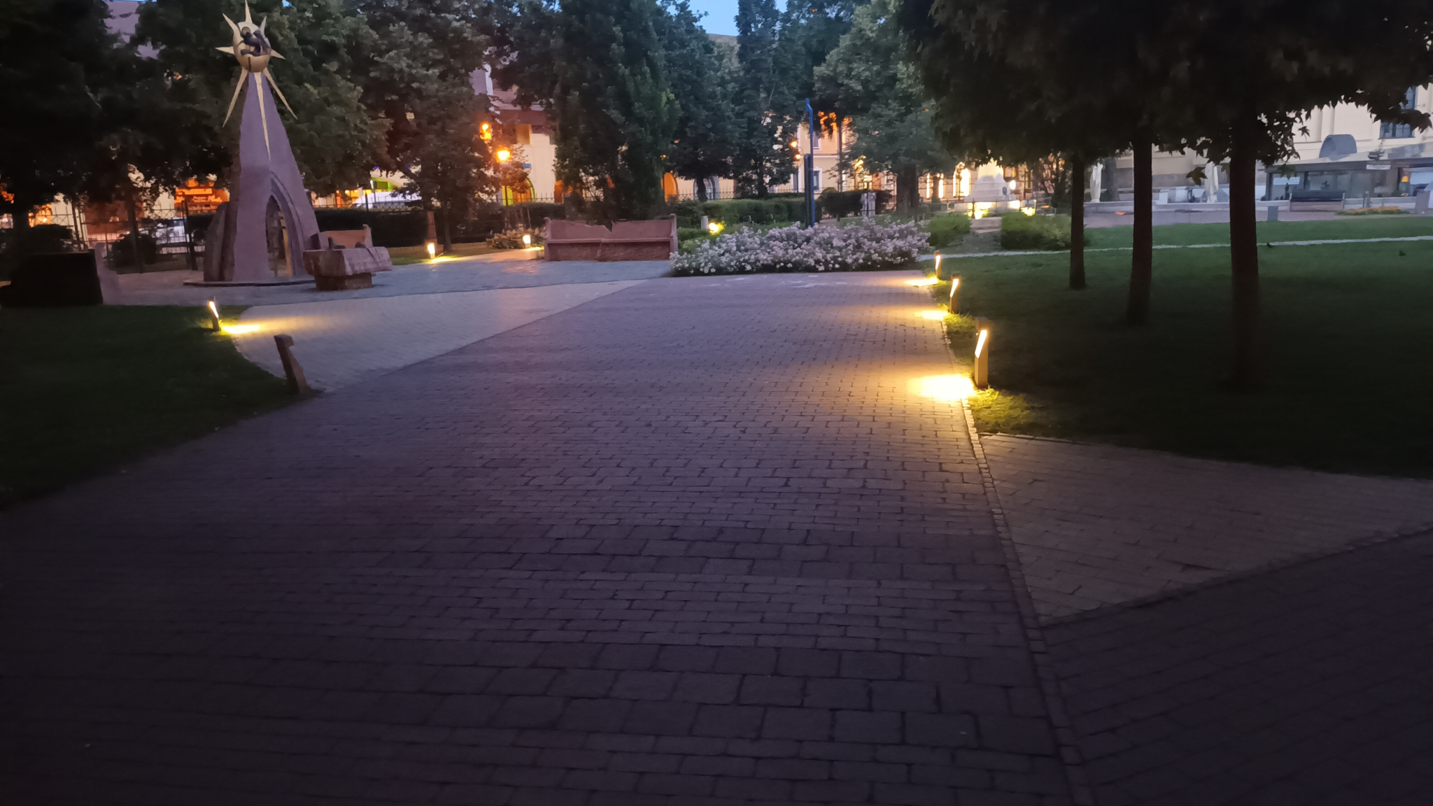 A Kálvin téren a Református Nagytemplom mögötti Emlékkert teljes területén sok helyen nem működnek a járdát megvilágító alacsony lámpatestek.