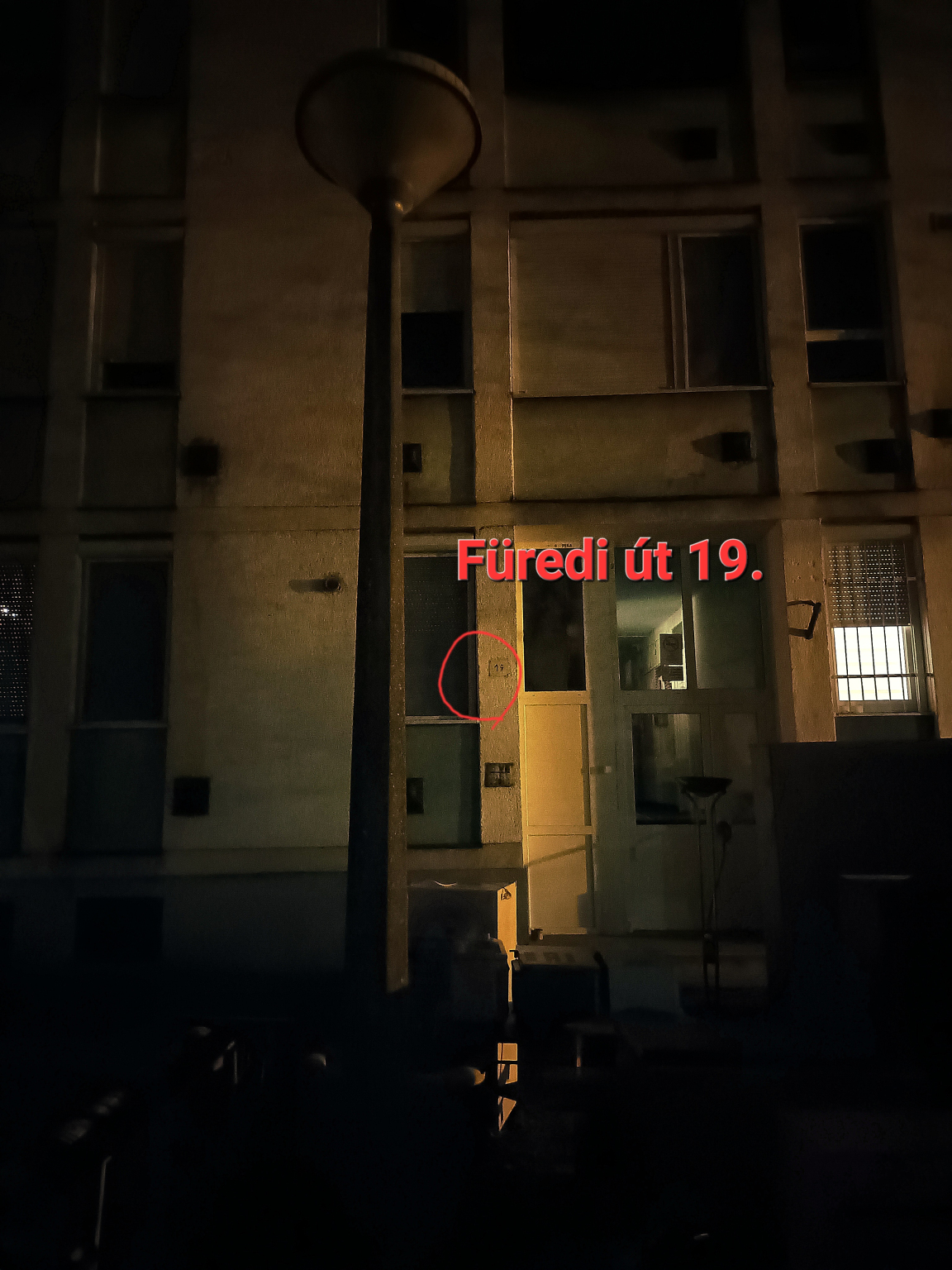 A Füredi út 19. szám alatti lépcsőház bejárata előtt megtalálható lámpa oszlop világítása nem működik.