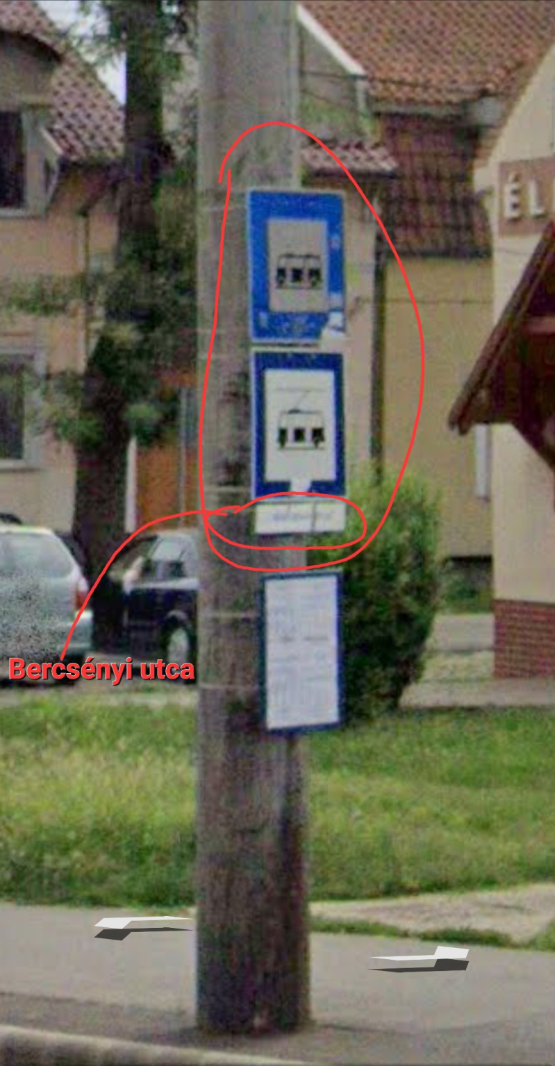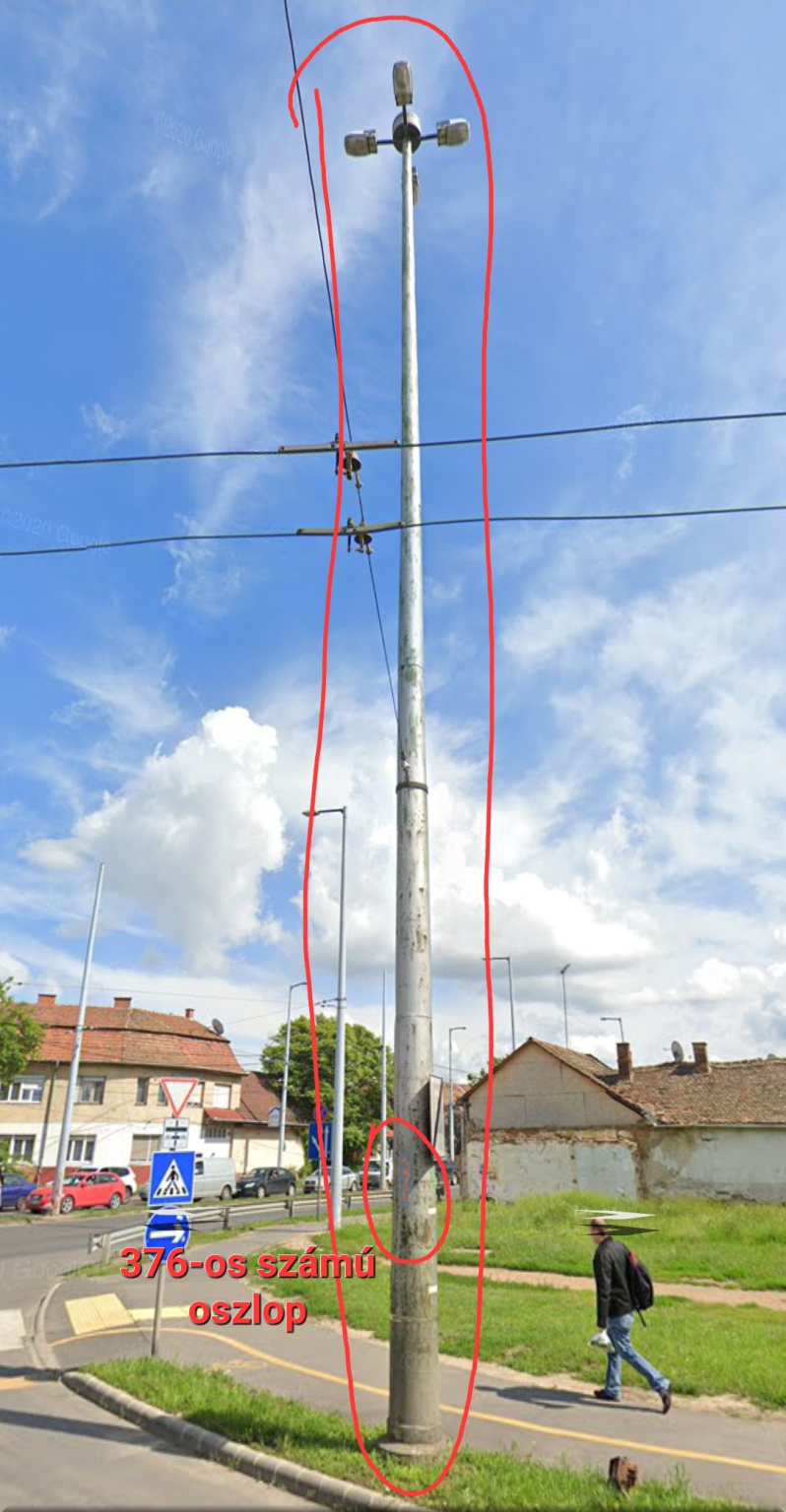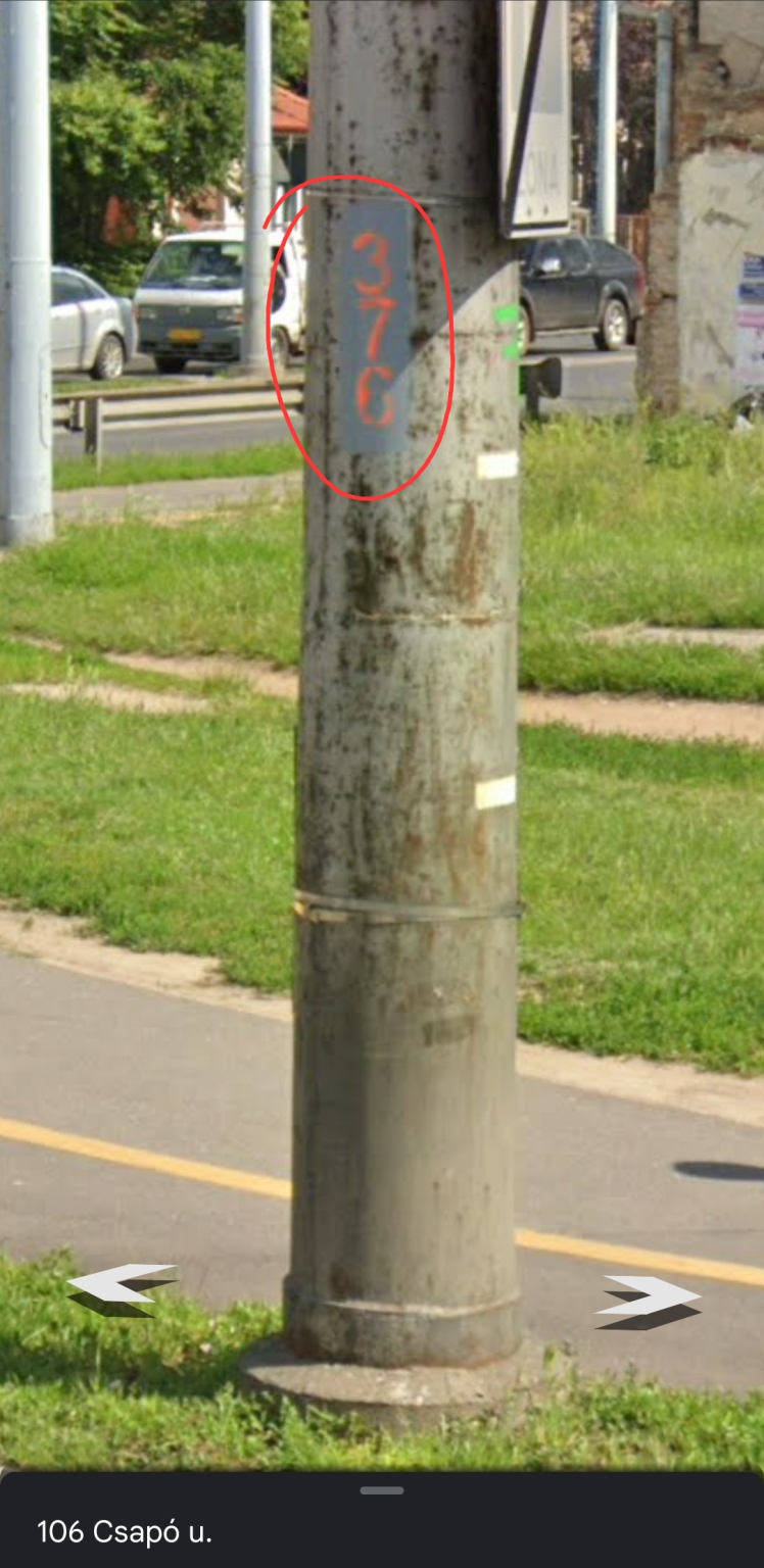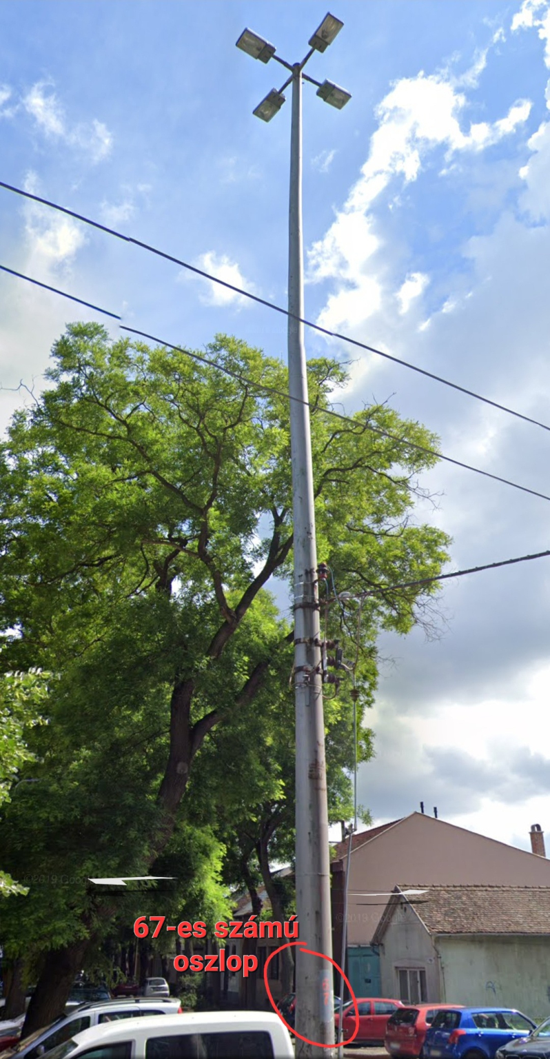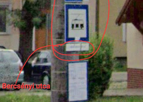 Az első hibás lámpa oszlop száma 67, az utolsó lámpa oszlop száma 376, a második lámpa oszlopon pedig egy "Buszmegálló" Kresz tábla illetve a buszmegálló elnevezését jelző tábla "Bercsényi utca" található és oszlop szám nincs rajta.