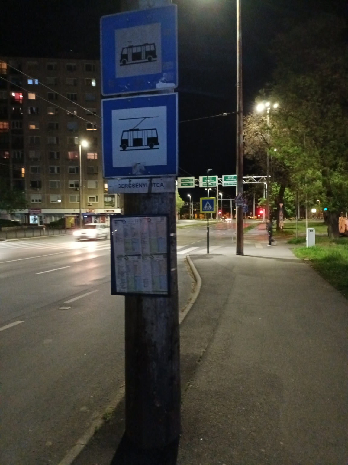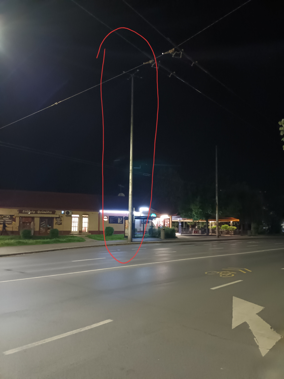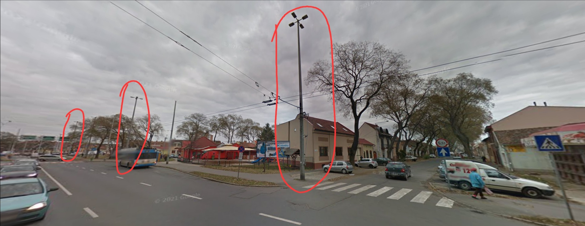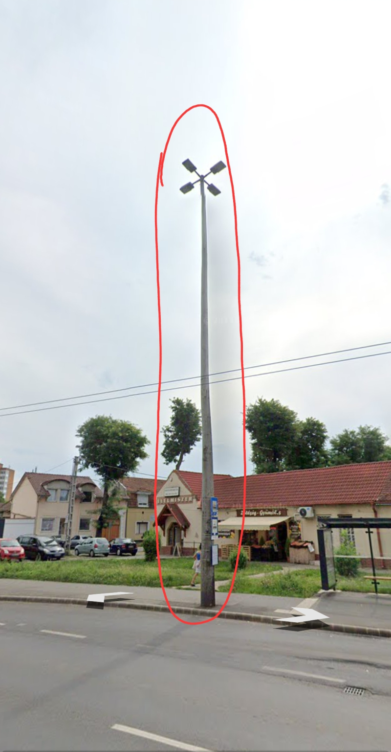 Az első hibás lámpa oszlop száma 67, az utolsó lámpa oszlop száma 376, a második lámpa oszlopon pedig egy "Buszmegálló" Kresz tábla illetve a buszmegálló elnevezését jelző tábla "Bercsényi utca" található és oszlop szám nincs rajta.